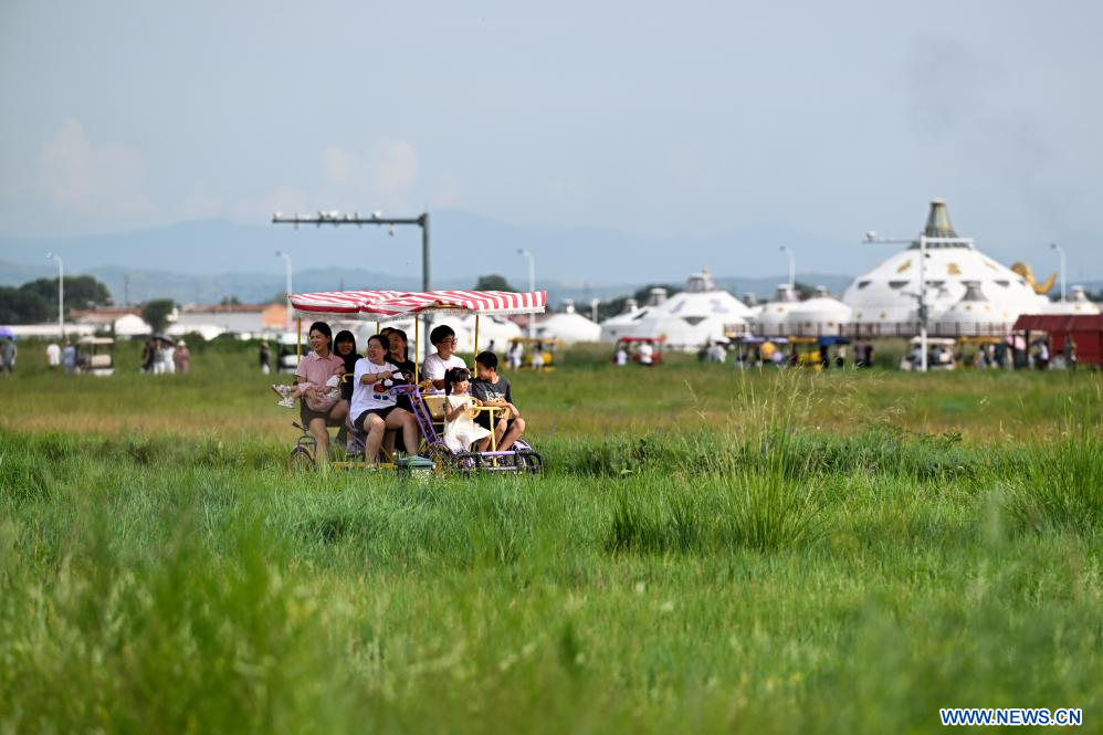 HOHHOT, 5 août (Xinhua) -- Des touristes visitent une prairie à Hohhot, dans la région autonome de Mongolie intérieure (nord de la Chine), le 3 août 2025. (Photo : Li Zhipeng)