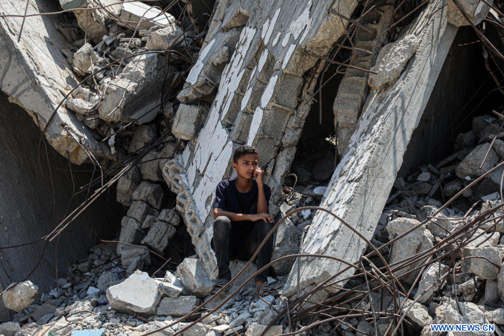 GAZA, 9 août (Xinhua) -- Un garçon est assis au milieu de décombres après une frappe aérienne israélienne dans le quartier d'Al-Rimal, à l'ouest de la ville de Gaza, le 8 août 2025. (Xinhua/Rizek Abdeljawad)
