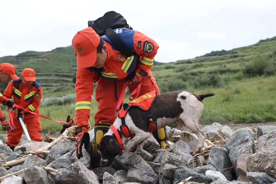 Un sauveteur et son chien renifleur recherchent des personnes disparues dans le village de Maliantan à Yuzhong, district de la province chinoise du Gansu (nord-ouest), le 10 août 2025. (Photo fournie par le Département d'incendie et de secours du Gansu)
