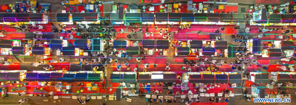 BEIJING, 14 août (Xinhua) -- Photo aérienne prise par un drone montrant un marché nocturne à Qingdao, ville de la province chinoise du Shandong (est), le 12 août 2025.