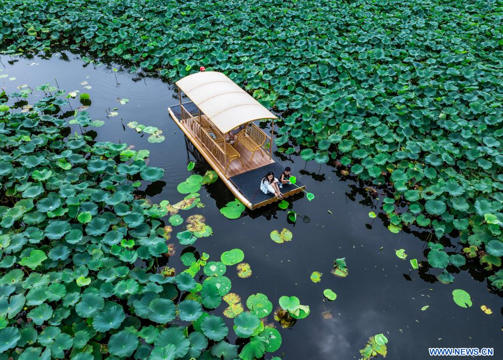 BEIJING, 14 août (Xinhua) -- Photo aérienne prise par un drone montrant un étang de lotus dans un site pittoresque de la ville de Xinghua, dans la province chinoise du Jiangsu (est), le 13 août 2025.