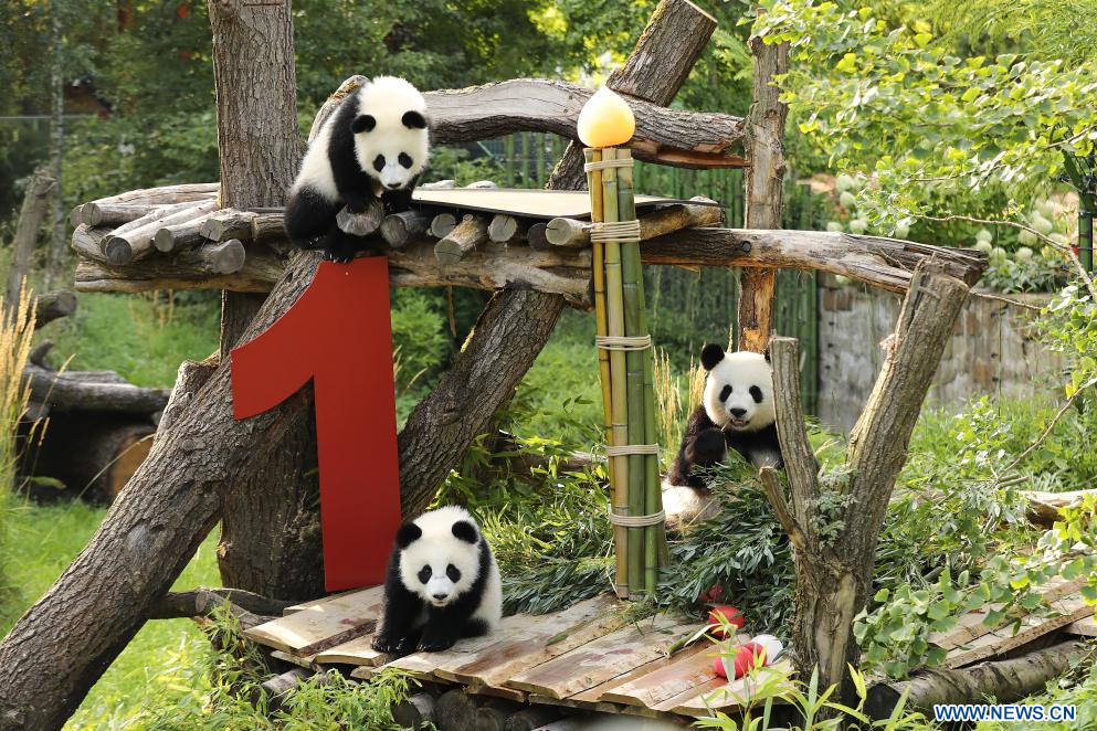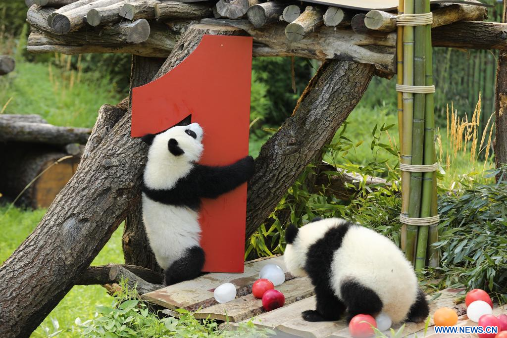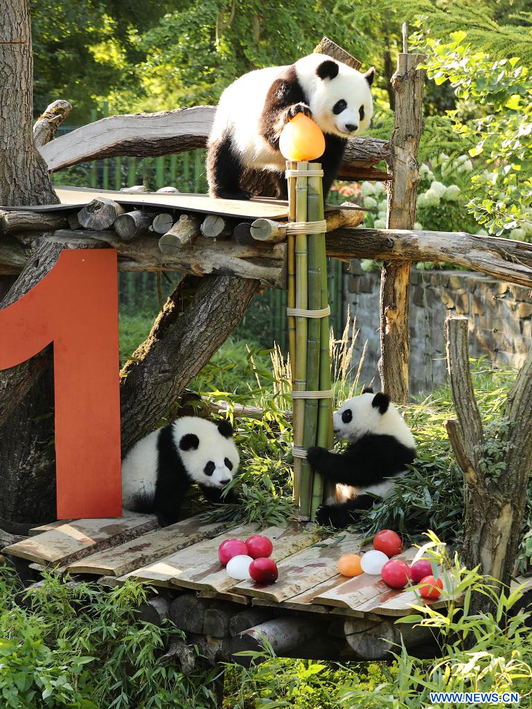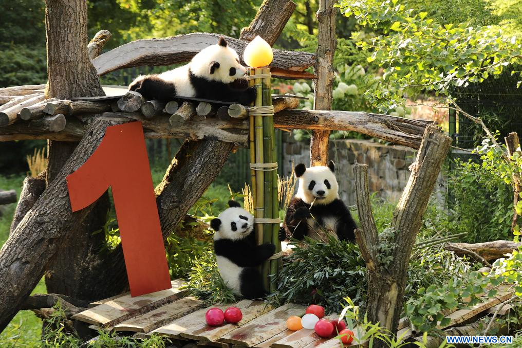 BERLIN, 22 août (Xinhua) -- Le chiffre "1" en bois rouge vif, des glaces à base de jus de betterave et de carotte, et une tige de bambou en guise de bougie d'anniversaire... telle était la scène vendredi dans l'enclos des pandas du zoo de Berlin, où les jumelles Leni et Lotti ont fêté leur tout premier anniversaire dans le plus pur style panda.