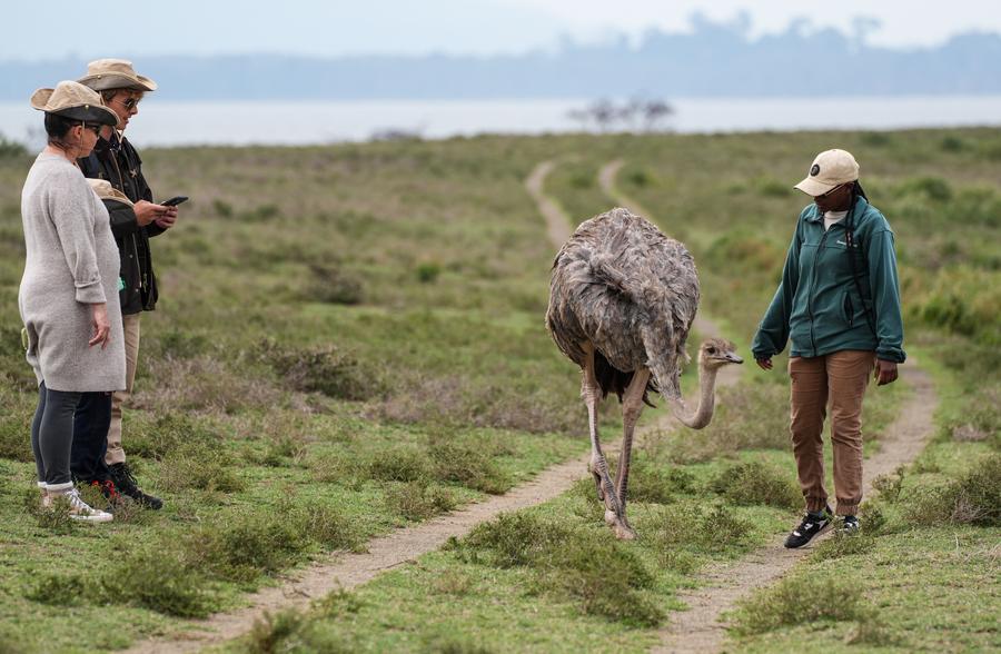 NAKURU, 24 août (Xinhua) -- Des touristes admirent des girafes sur l'île Crescent, sur le lac Naivasha, dans le comté de Nakuru, au Kenya, le 23 août 2025. Le lac Naivasha, situé dans la vallée du Grand Rift à une altitude d'environ 1.900 mètres, est un lac d'eau douce. Son île Crescent est connue pour la faune sauvage en liberté, notamment des girafes, des zèbres et des antilopes. (Xinhua/Li Yahui)Un garde forestier local interagit avec une autruche sur l'île Crescent, sur le lac Naivasha, dans le comté de Nakuru, au Kenya, le 23 août 2025. (Xinhua/Li Yahui)Un zèbre passe devant des touristes sur l'île Crescent, sur le lac Naivasha, dans le comté de Nakuru, au Kenya, le 23 août 2025. (Xinhua/Li Yahui)