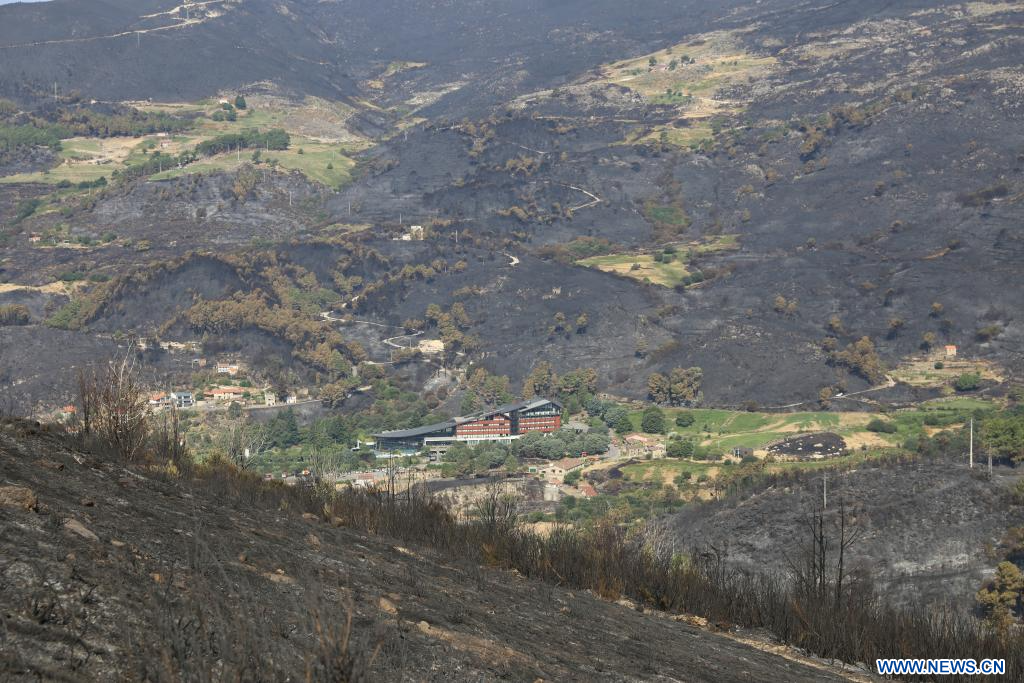 Photo montrant le village d'Unhais da Serra, au milieu de montagnes ravagées par les flammes, au Portugal, le 23 août 2025. (Xinhua/Xun Wei)