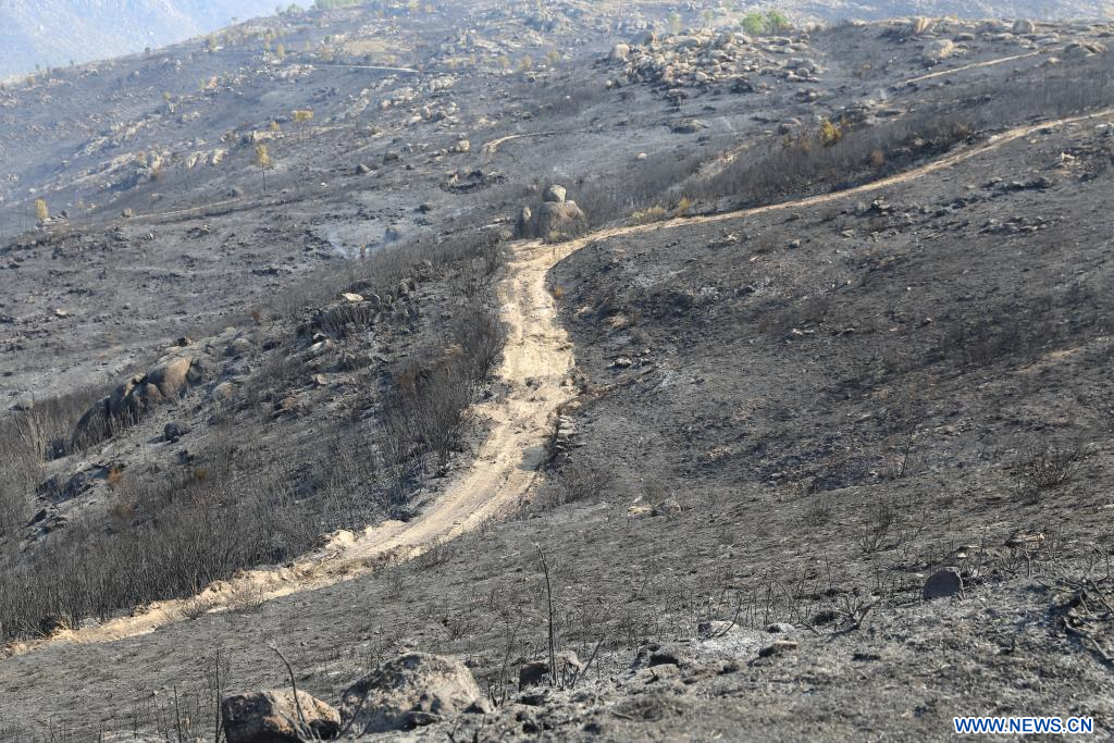 Photo montrant les montagnes ravagées par les incendies près d'Unhais da Serra, au Portugal, le 23 août 2025. (Xinhua/Xun Wei)