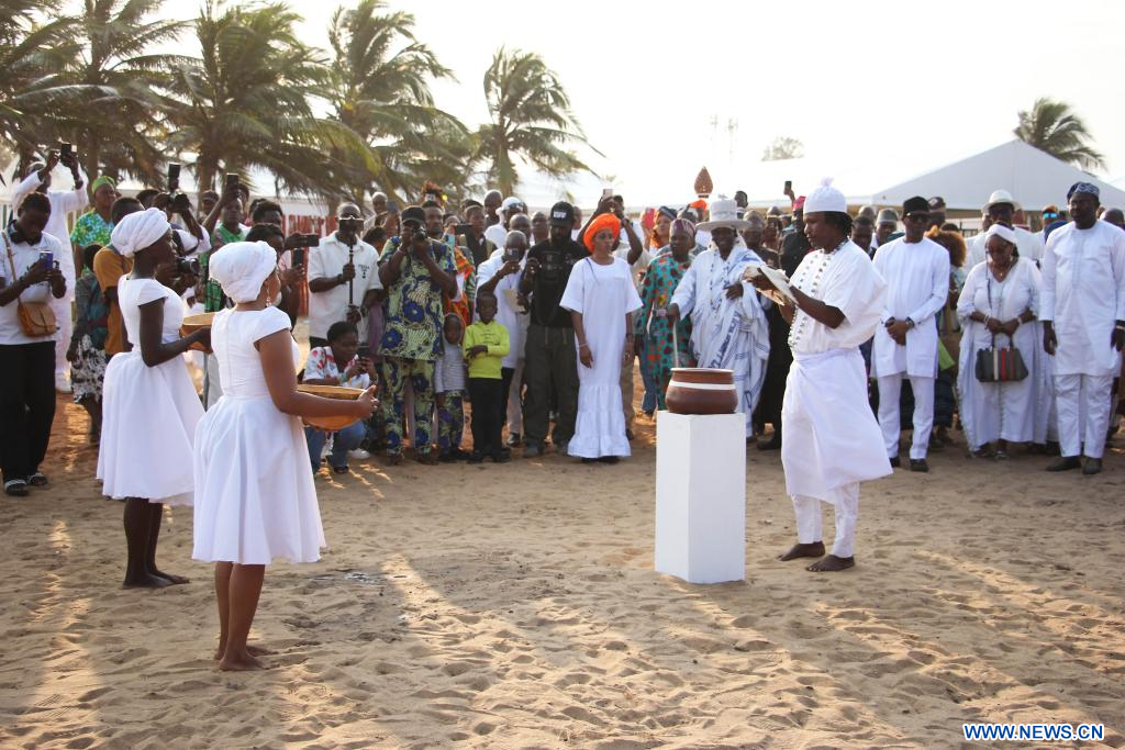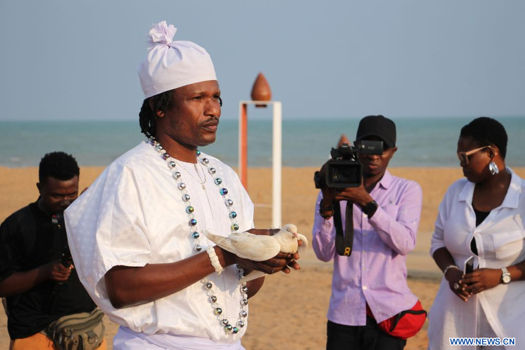 OUIDAH (Bénin), 23 août (Xinhua) -- Des Afrodescendants et des responsables politico-administratifs et religieux ont rendu hommage aux victimes de la traite négrière samedi à Ouidah, cité historique située dans le sud du Bénin, à l'occasion de la Journée internationale du souvenir de la traite négrière et de son abolition (JISTNA).