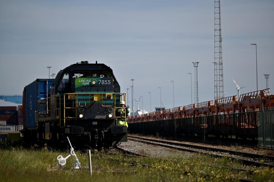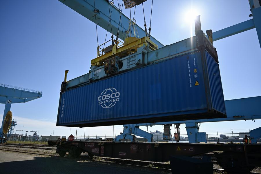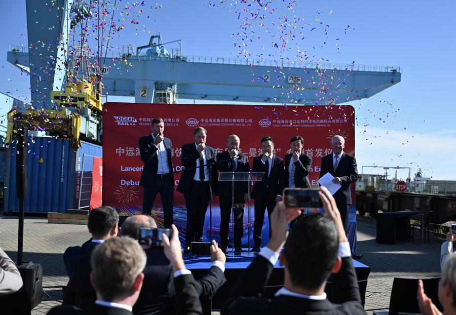 BRUXELLES, 26 août (Xinhua) -- Le premier train-bloc Zeebrugge-Mannheim part du terminal CSP Zeebrugge en Belgique, le 25 août 2025. Le service de train-bloc Zeebrugge-Mannheim a été inauguré lundi au terminal CSP Zeebrugge en Belgique. Le lancement officiel du corridor reliant la porte d'entrée de l'Europe du Nord-Ouest au cœur industriel du continent marque une avancée significative dans le développement du réseau régional de chaîne d'approvisionnement du groupe China COSCO Shipping en Europe. (Xinhua/Lyu You)Photo prise le 25 août 2025 montrant la cérémonie d'inauguration du service de train-bloc Zeebrugge-Mannheim au terminal CSP Zeebrugge en Belgique. (Xinhua/Lyu You)Le dernier conteneur est chargé sur le premier train-bloc Zeebrugge-Mannheim avant son départ du terminal CSP Zeebrugge en Belgique, le 25 août 2025. (Xinhua/Lyu You)