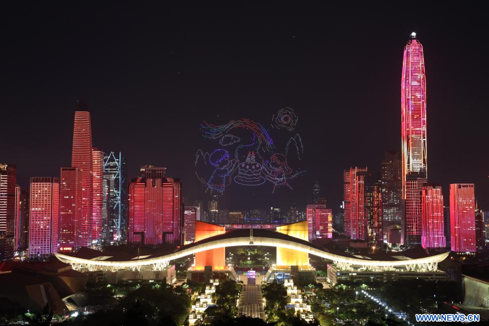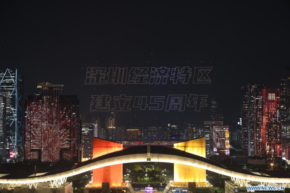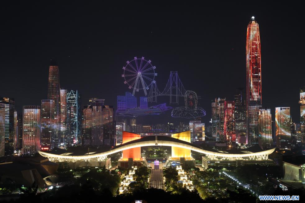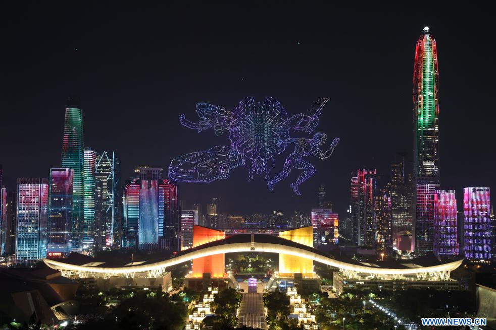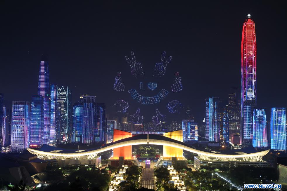 SHENZHEN, 27 août (Xinhua) -- Spectacle de drones lumineux à l'occasion du 45e anniversaire de la zone économique spéciale de Shenzhen, dans la province du Guangdong, dans le sud de la Chine, le 26 août 2025. (Photo : Mao Siqian)