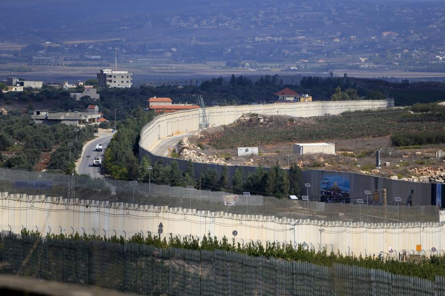 Photo d'archives prise le 19 octobre 2023 montrant des casques bleus de la Force intérimaire des Nations Unies au Liban (FINUL) qui patrouillent à la frontière libano-israélienne à Odaisseh, dans le sud du Liban. (Photo par Ali Hashisho/Xinhua)