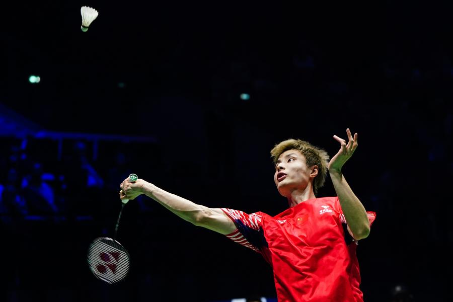 PARIS, 1er septembre (Xinhua) -- Le Chinois Shi Yuqi effectue un retour lors de la finale du simple messieurs contre le Thaïlandais Kunlavut Vitidsarn lors des Championnats du monde de badminton 2025 à Paris, en France, le 31 août 2025. Au terme d'une finale éprouvante en trois manches, M. Shi a battu le champion en titre thaïlandais 19-21, 21-10, 21-18. (Xinhua/Peng Ziyang)