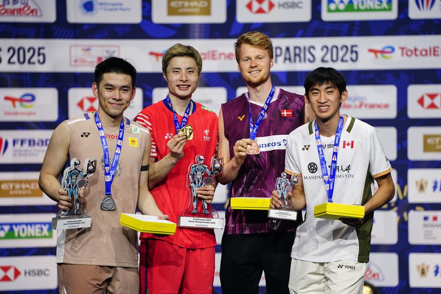 PARIS, 1er septembre (Xinhua) -- Le médaillé d'or Shi Yuqi (2e à gauche) de Chine, le médaillé d'argent Kunlavut Vitidsarn (1er à gauche) de Thaïlande, les médaillés de bronze Anders Antonsen (2e à droite) du Danemark et Victor Lai du Canada posent pour une photo lors de la cérémonie de remise des médailles du simple messieurs aux Championnats du monde de badminton 2025 à Paris, en France, le 31 août 2025. Au terme d'une finale éprouvante en trois manches, M. Shi a battu le champion en titre thaïlandais 19-21, 21-10, 21-18. (Xinhua/Peng Ziyang)