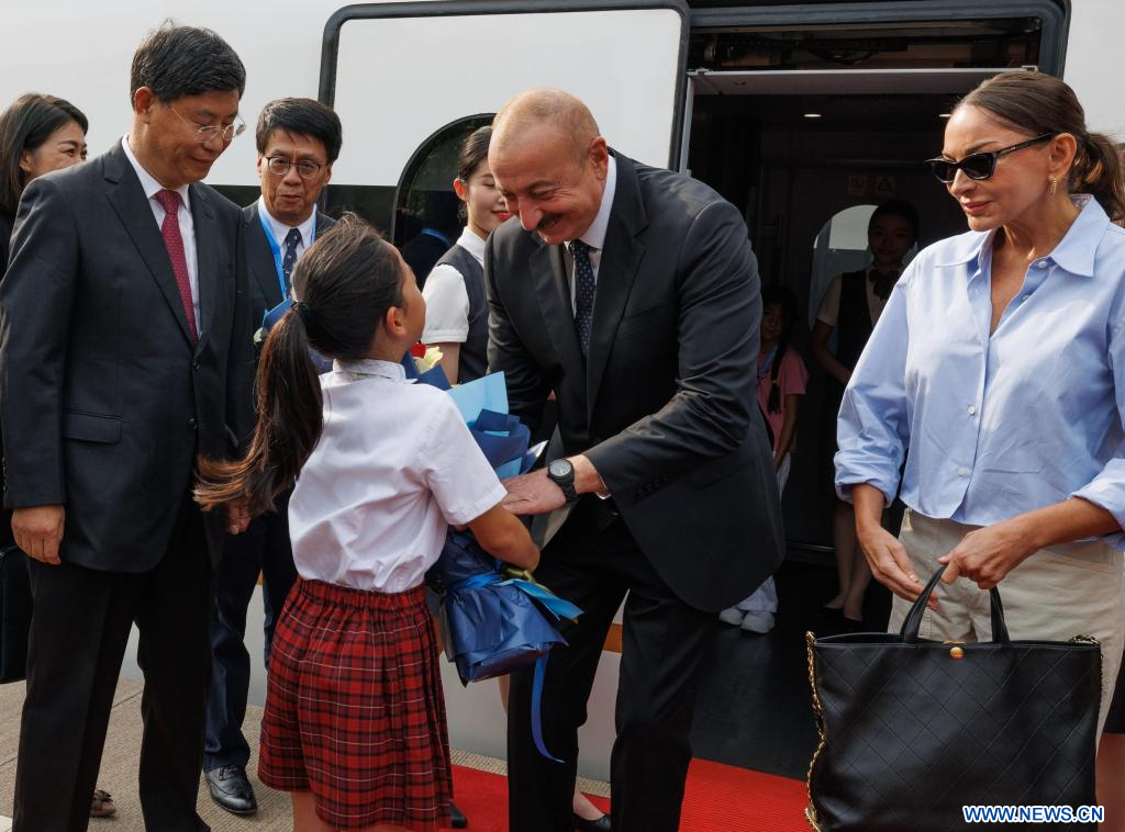 BEIJING, 2 septembre (Xinhua) -- Le président azerbaïdjanais, Ilham Aliyev, arrive à Beijing, capitale chinoise, le 2 septembre 2025, pour les commémorations marquant le 80e anniversaire de la victoire de la Guerre de résistance du peuple chinois contre l'agression japonaise et de la Guerre mondiale antifasciste. (Photo : Jin Liwang)