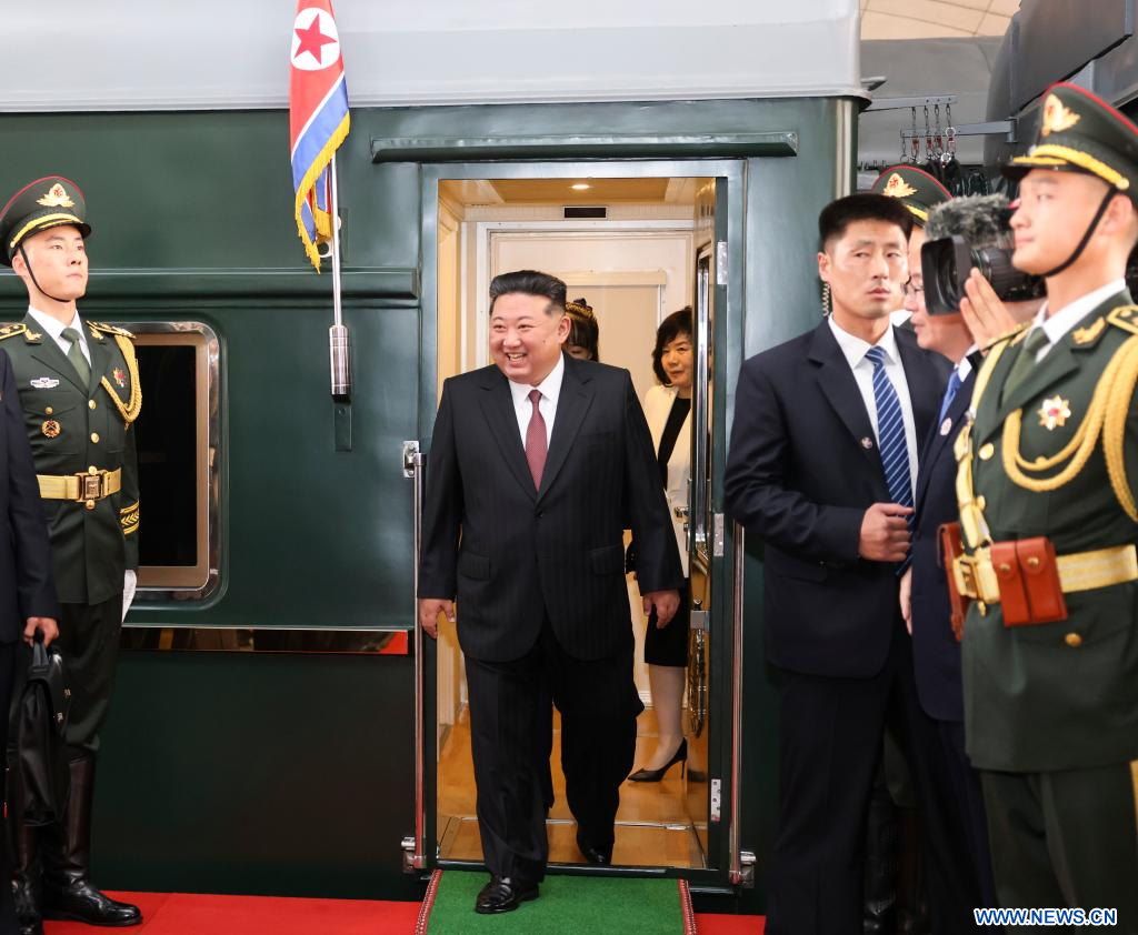 BEIJING, 2 septembre (Xinhua) -- Kim Jong Un, secrétaire général du Parti des travailleurs de Corée et président des Affaires d'Etat de la République populaire démocratique de Corée (RPDC), arrive à Beijing, capitale chinoise, le 2 septembre 2025, pour participer aux commémorations marquant le 80e anniversaire de la victoire de la Guerre de résistance du peuple chinois contre l'agression japonaise et de la Guerre mondiale antifasciste. (Photo : Pang Xinglei)