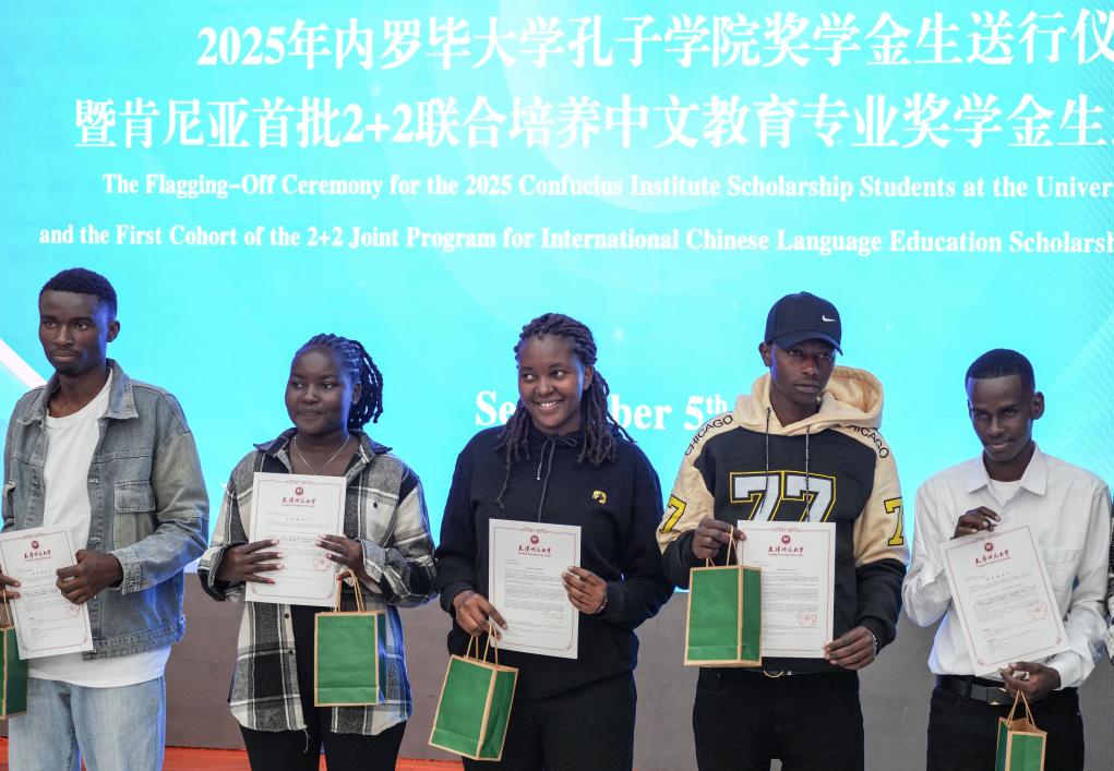 NAIROBI, 5 septembre (Xinhua) -- Des boursiers, en route pour l'Université normale de Tianjin en Chine pour y suivre des études avancées de mandarin, posent pour une photo lors d'une cérémonie de départ à Nairobi, au Kenya, le 5 septembre 2025. Cette cérémonie a été organisée vendredi pour ces boursiers de l'Institut Confucius à l'Université de Nairobi. Parmi eux, vingt étudiants vont suivre un programme d'études de deux ans. (Xinhua/Li Yahui)