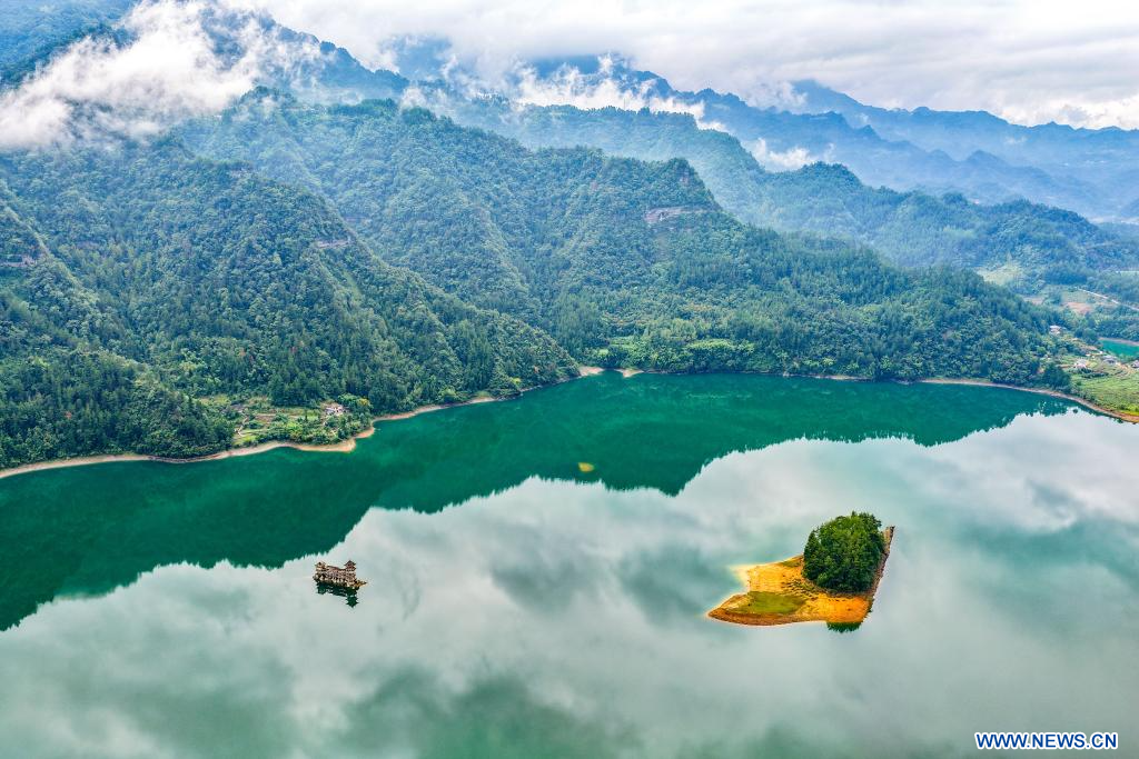 CHONGQING, 10 septembre (Xinhua) -- Vue aérienne de la réserve naturelle des zones humides de Xiaonanhai, située à Chongqing, dans le sud-ouest de la Chine, le 9 septembre 2025. (Photo : Tang Yi)