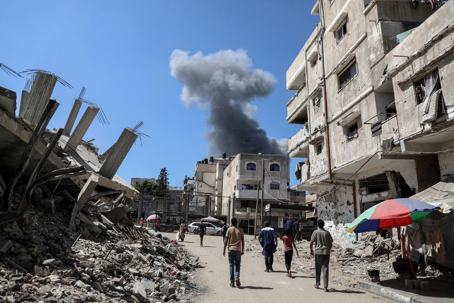 GAZA, 11 septembre (Xinhua) -- De la fumée s'échappe des décombres de la tour Taïba, un bâtiment de onze étages détruit à la suite d'une frappe aérienne israélienne, dans l'ouest de la ville de Gaza, le 10 septembre 2025. (Xinhua/Rizek Abdeljawad)