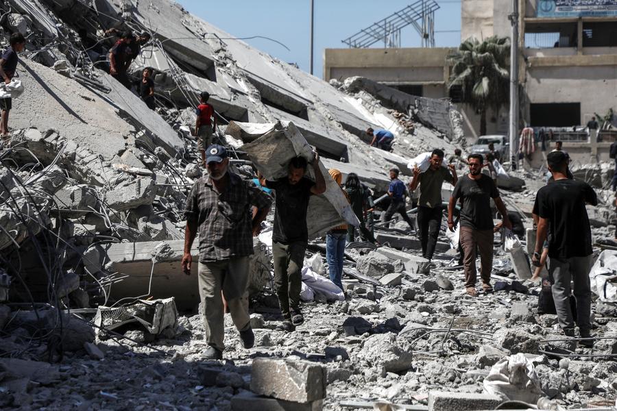 Des Palestiniens au milieu des décombres de la tour Taïba. (Xinhua/Rizek Abdeljawad)