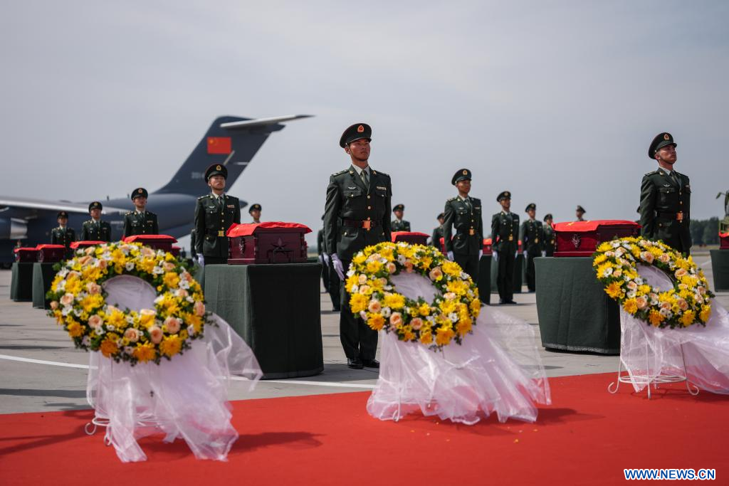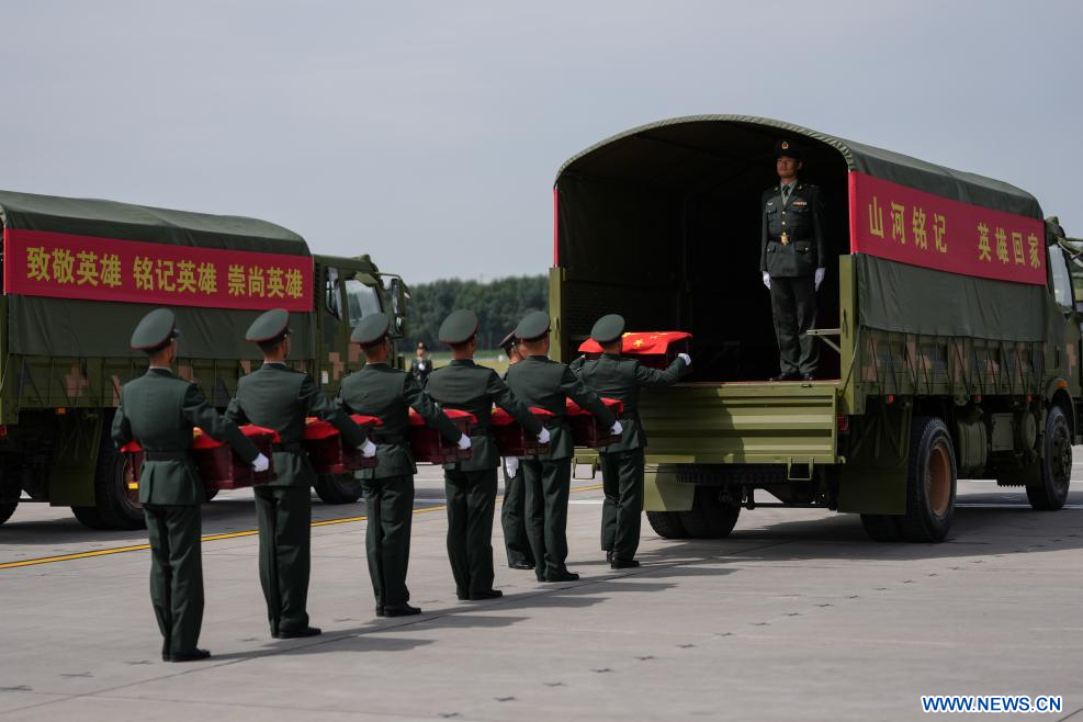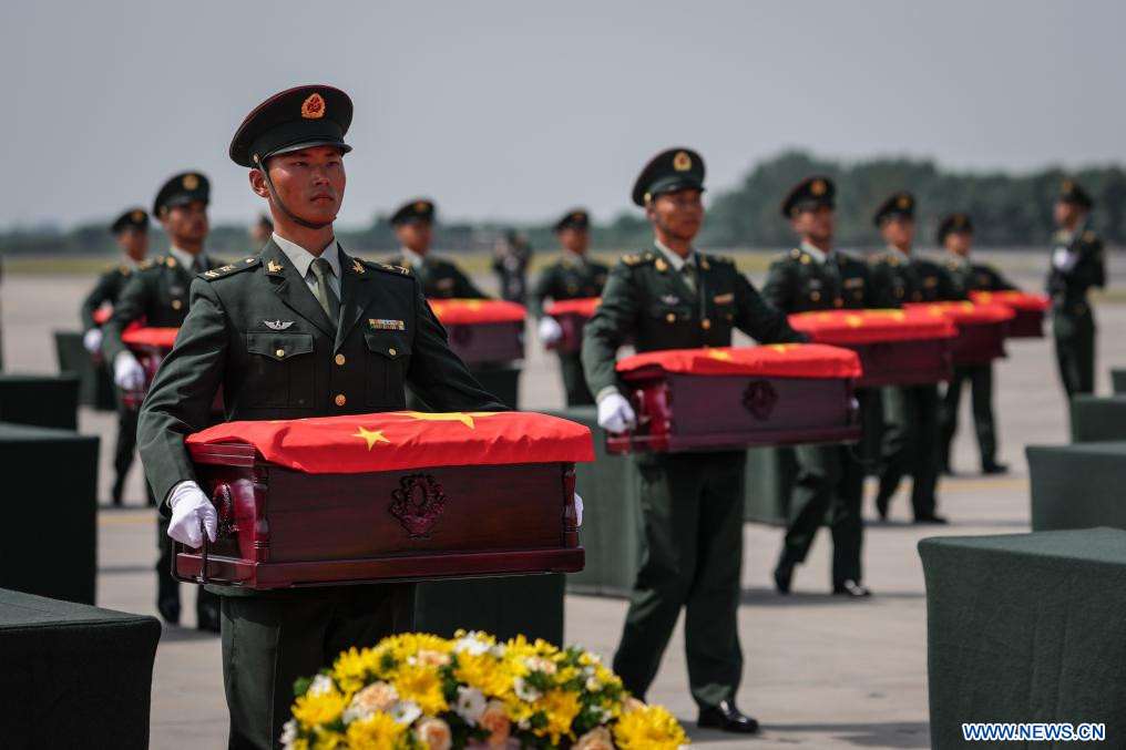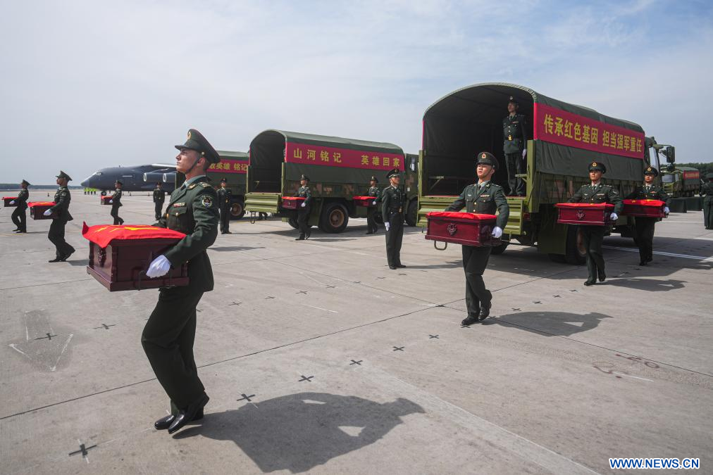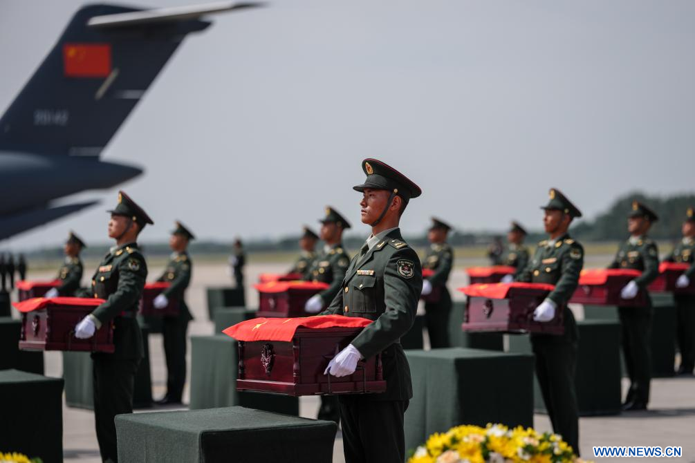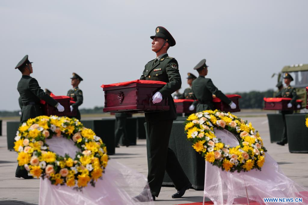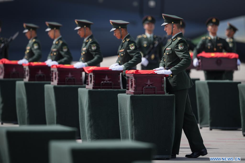 A la suite de la remise des dépouilles des martyrs et de leurs effets personnels par la République de Corée à la partie chinoise à Incheon vendredi matin, la Chine a organisé une cérémonie commémorative à l'Aéroport international d'Incheon. Durant la cérémonie, l'hymne national chinois a retenti, et chaque cercueil a été recouvert du drapeau national de la Chine. Les participants se sont inclinés trois fois en hommage aux martyrs avant de placer leurs dépouilles dans l'avion.