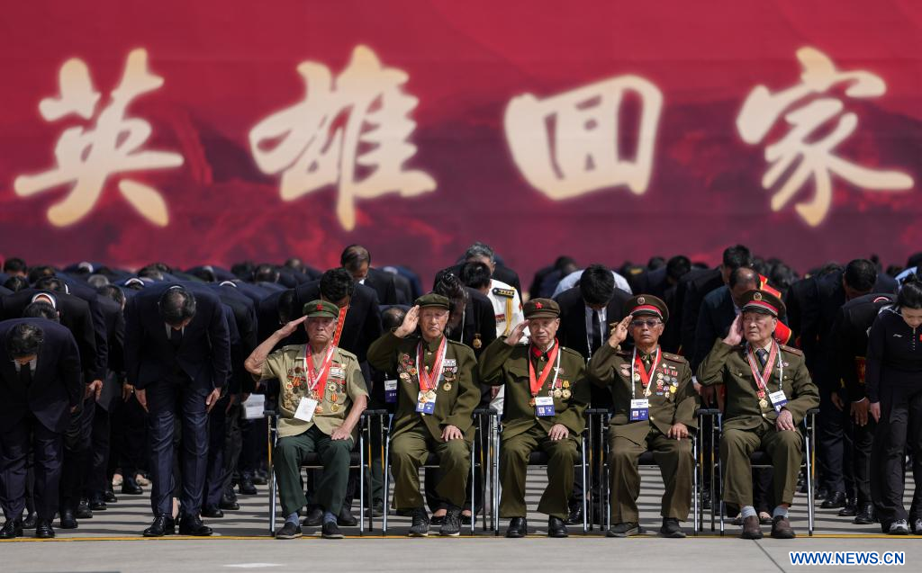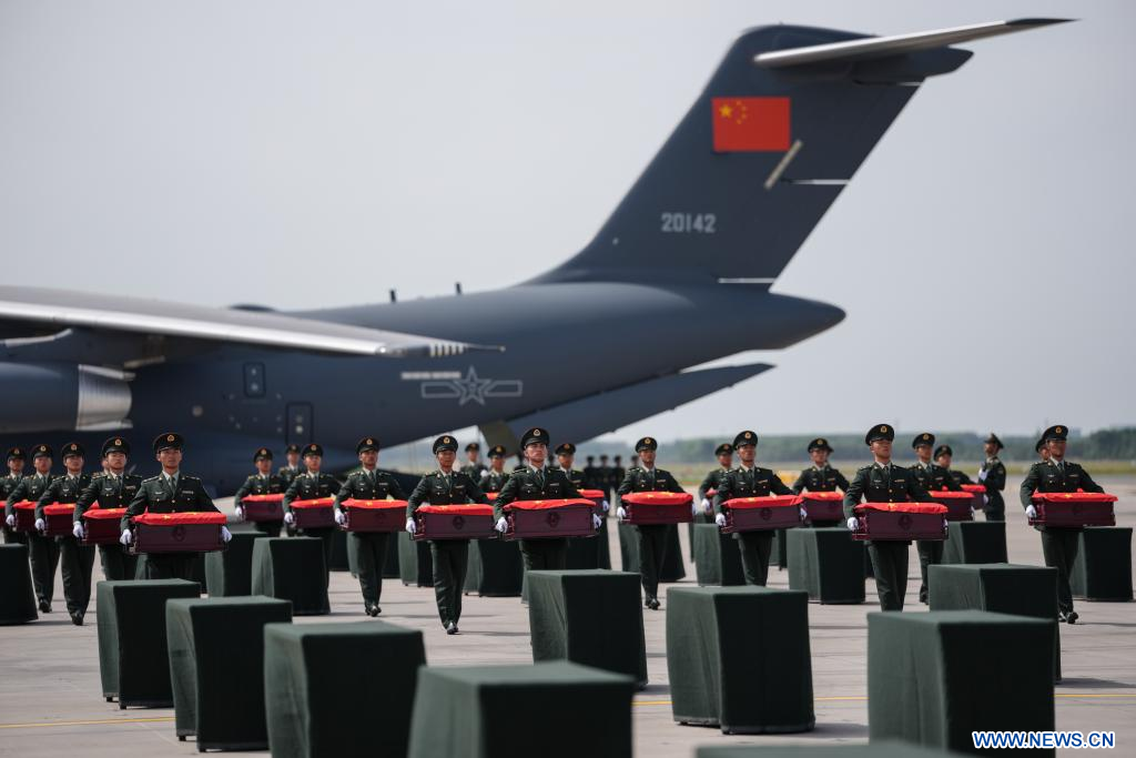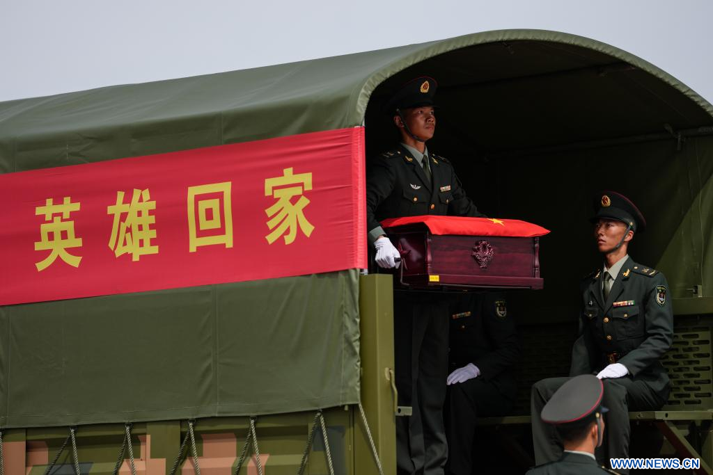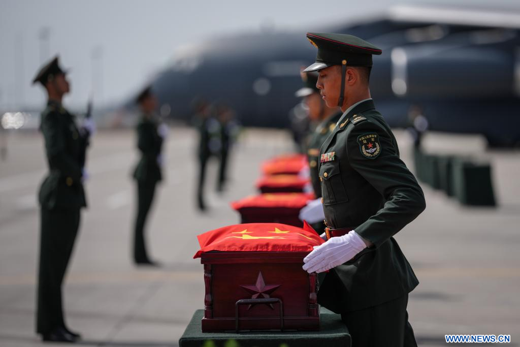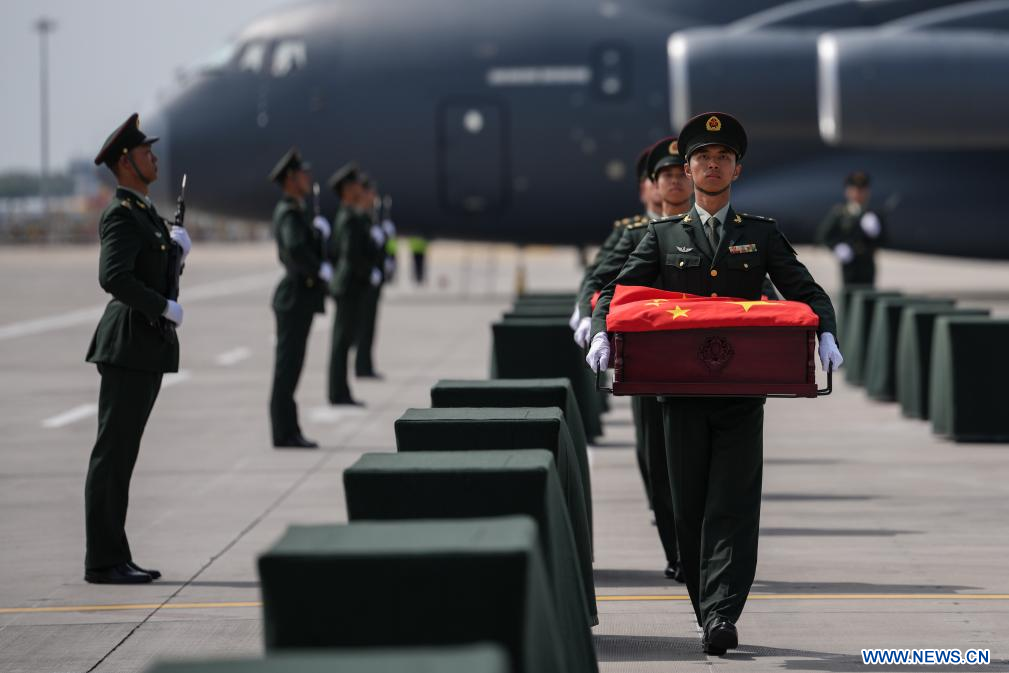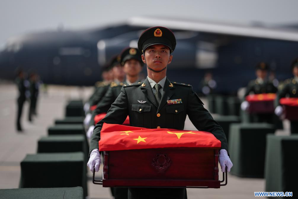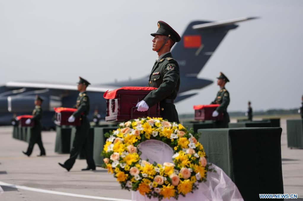 A la suite de la remise des dépouilles des martyrs et de leurs effets personnels par la République de Corée à la partie chinoise à Incheon vendredi matin, la Chine a organisé une cérémonie commémorative à l'Aéroport international d'Incheon. Durant la cérémonie, l'hymne national chinois a retenti, et chaque cercueil a été recouvert du drapeau national de la Chine. Les participants se sont inclinés trois fois en hommage aux martyrs avant de placer leurs dépouilles dans l'avion.