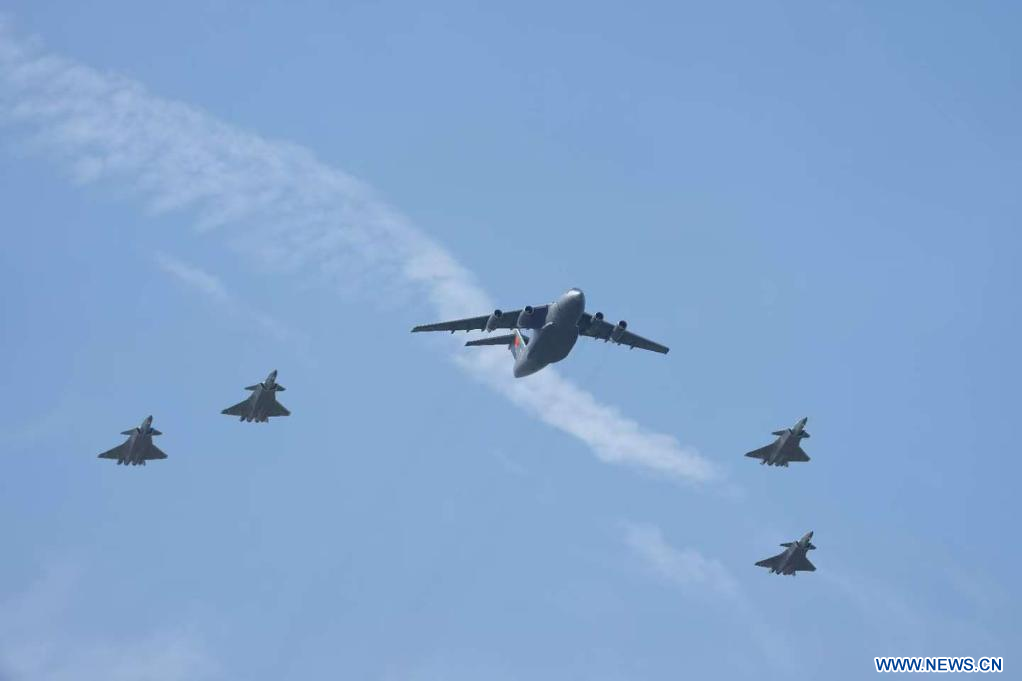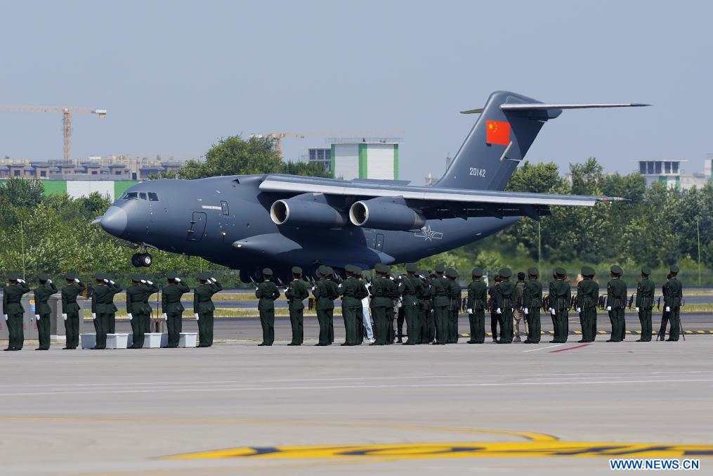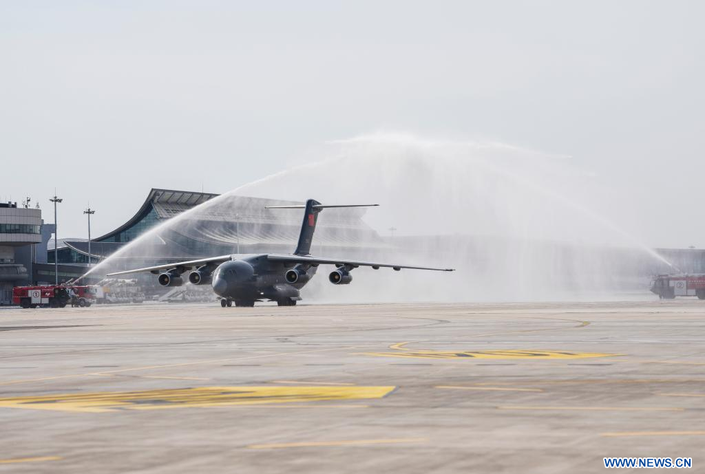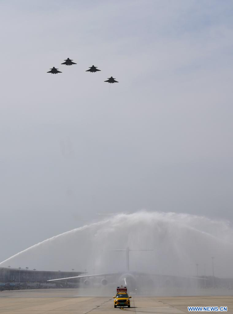 Après être entré dans l'espace aérien chinois, l'avion de transport Y-20 a été escorté par quatre avions de chasse J-20. A son atterrissage à l'aéroport, il a reçu une haie d'honneur avec des jets d'eau.