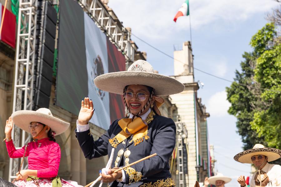 OAXACA (MEXIQUE), 16 septembre (Xinhua) -- Une fille vêtue d'un costume traditionnel monte à cheval lors de la célébration du Jour de l'Indépendance à Oaxaca, dans l'Etat d'Oaxaca, au Mexique, le 16 septembre 2025. (Xinhua/Li Mengxin)