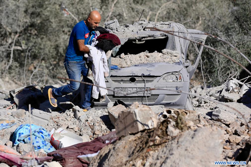 BORJ QALAOUIYE (Liban), 19 septembre (Xinhua) -- Photo prise le 19 septembre 2025 montrant des habitants à Borj Qalaouiyé, dans le sud du Liban, qui récupèrent leurs effets personnels dans les ruines de leur maison, détruite lors des frappes aériennes israéliennes dans la nuit de jeudi. (Xinhua/Ali Hashisho)