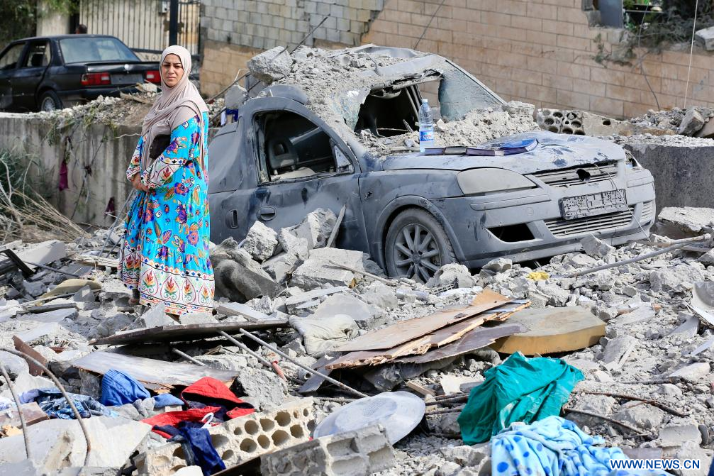 BORJ QALAOUIYE (Liban), 19 septembre (Xinhua) -- Photo prise le 19 septembre 2025 à Borj Qalaouiyé, dans le sud du Liban, montrant une femme debout sur les ruines de leur maison, détruite lors des frappes aériennes israéliennes dans la nuit de jeudi. (Xinhua/Ali Hashisho)