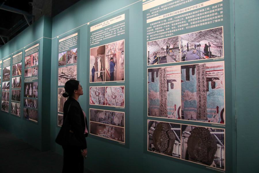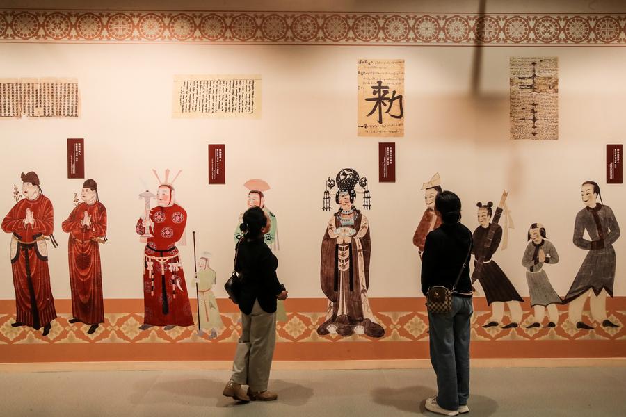 Des visiteurs contemplent une exposition lors de la 8e Exposition culturelle internationale de la Route de la Soie (Dunhuang) à Dunhuang, dans la province chinoise du Gansu (nord-ouest), le 22 septembre 2025. (Photo : Lang Bingbing)
