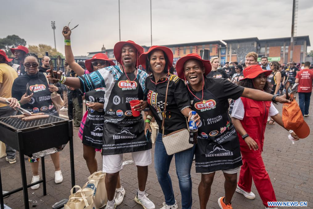 JOHANNESBURG, 25 septembre (Xinhua) -- Des gens posent pour des photos lors d'un festival de barbecue organisé au stade Loftus Versfeld de Pretoria, en Afrique du Sud, le 24 septembre 2025.