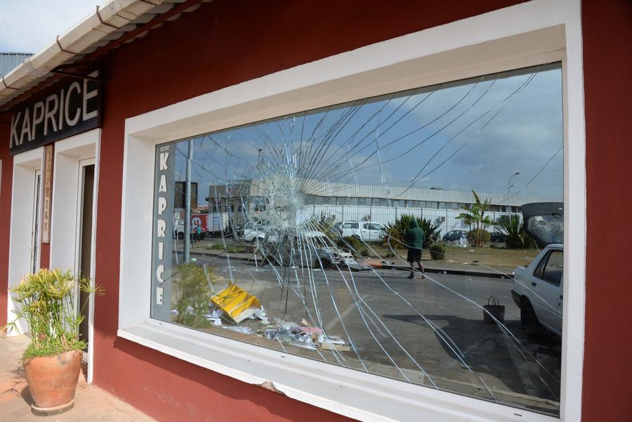 ANTANANARIVO, 26 septembre (Xinhua) -- Photo montrant une devanture de magasin endommagée dans le quartier commerçant d'Antananarivo, la capitale de Madagascar, le 26 septembre 2025. Le président malgache Andry Rajoelina a condamné vendredi ces incidents violents qui se sont produits la veille, en particulier à Antananarivo, tout en exhortant tous les Malgaches à rester calmes. (Xinhua/Sitraka Rajaonarison)Photo montrant une voiture incendiée dans le quartier commerçant d'Antananarivo, la capitale de Madagascar, le 26 septembre 2025. (Xinhua/Sitraka Rajaonarison)