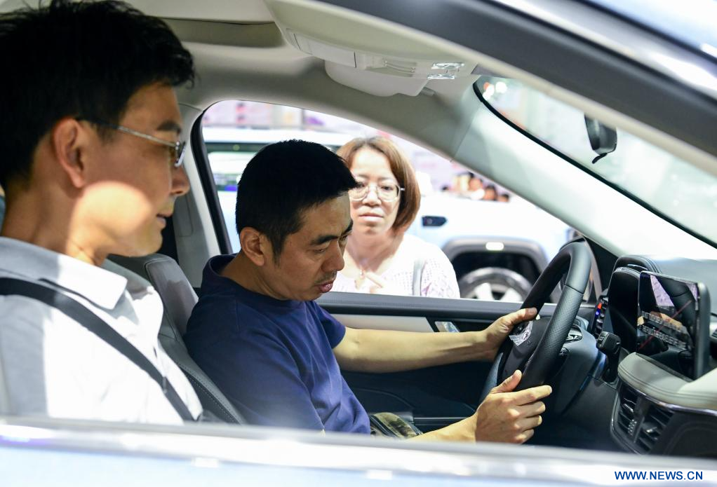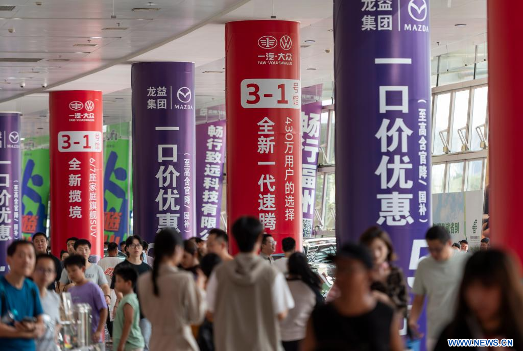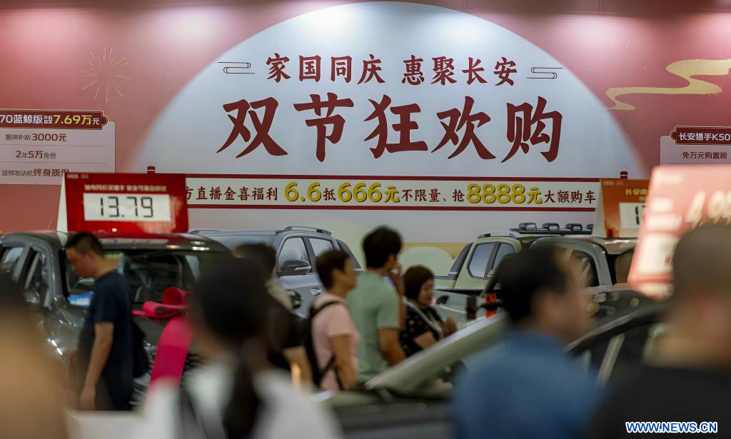 FUZHOU, 2 octobre (Xinhua) -- Des visiteurs s'informent sur les activités visant à promouvoir la consommation lors du 46e Salon international de l'automobile de Chine (Fuzhou), dans la province du Fujian, dans l'est de la Chine, le 1er octobre 2025.