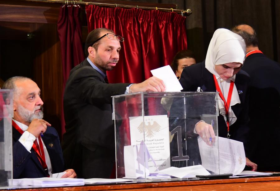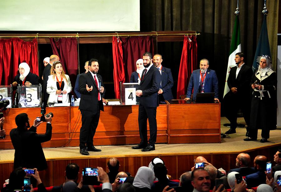 DAMAS, 5 octobre (Xinhua) -- Le dirigeant syrien Ahmad al-Chareh (à droite, au premier plan) est photographié dans un bureau de vote pour les élections de la nouvelle législature syrienne à Damas, en Syrie, le 5 octobre 2025. Les autorités de transition syriennes ont lancé dimanche les premières élections législatives du pays depuis la chute de l'ancien président Bachar el-Assad en décembre dernier, marquant ainsi une nouvelle étape dans la transition politique post-conflit du pays. (Xinhua/Ammar Safarjalani)Le dirigeant syrien Ahmad al-Chareh (au centre) est photographié dans un bureau de vote pour les élections de la nouvelle législature syrienne à Damas, en Syrie, le 5 octobre 2025. (Xinhua/Ammar Safarjalani)Cette photo a été prise le 5 octobre 2025 dans un bureau de vote pour les élections de la nouvelle législature syrienne à Damas, en Syrie. (Xinhua/Ammar Safarjalani)