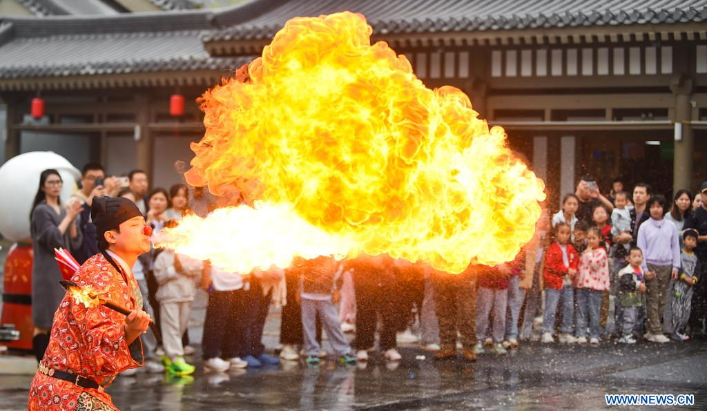 LUOYANG, 6 octobre (Xinhua) -- Un artiste folklorique se produit pour des touristes dans une rue pittoresque ancienne située dans l'arrondissement de Luolong, à Luoyang, ville de la province chinoise du Henan (centre), le 5 octobre 2025. Les destinations touristiques à travers la Chine connaissent une affluence de touristes en raison des congés de la Fête nationale et de la Fête de la mi-automne, qui ont débuté mercredi dernier et durent huit jours. (Photo : Huang Zhengwei)