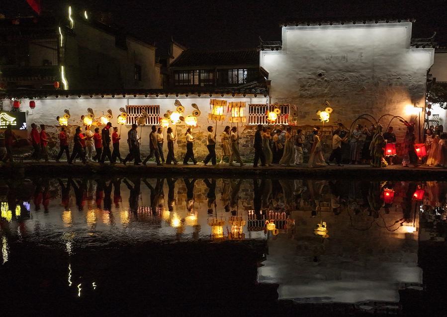 Des personnes participant à une parade de lanternes dans le village de Hongcun à Yixian, district de la province de l'Anhui, dans l'est de la Chine, le 5 octobre 2025. (Photo : Shi Yalei)