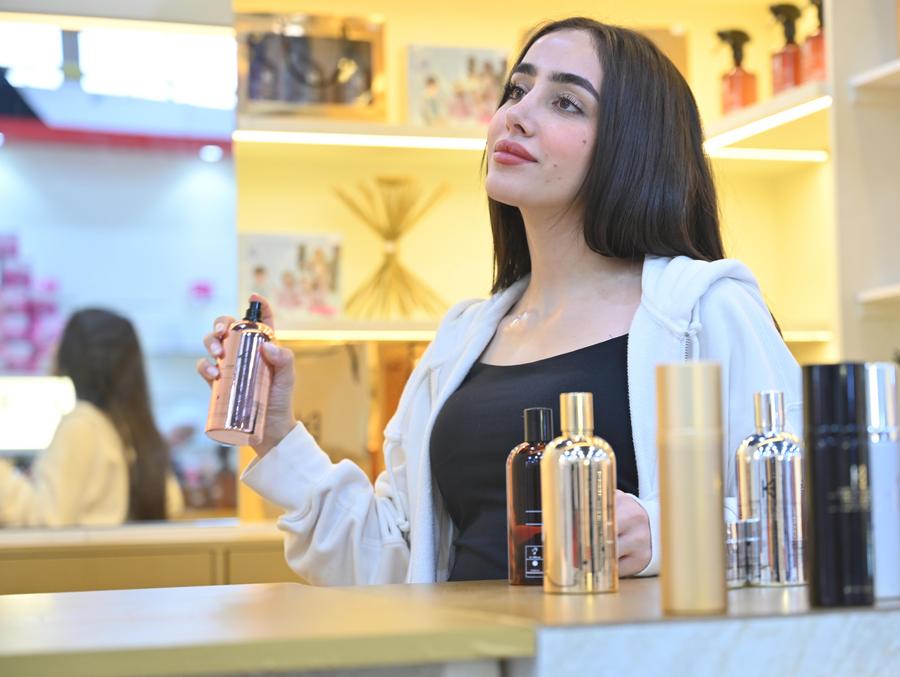 Une femme essaie un parfum lors d'une exposition consacrée aux parfums dans le gouvernorat de Hawalli, au Koweït, le 21 octobre 2025. (Xinhua/Asad)