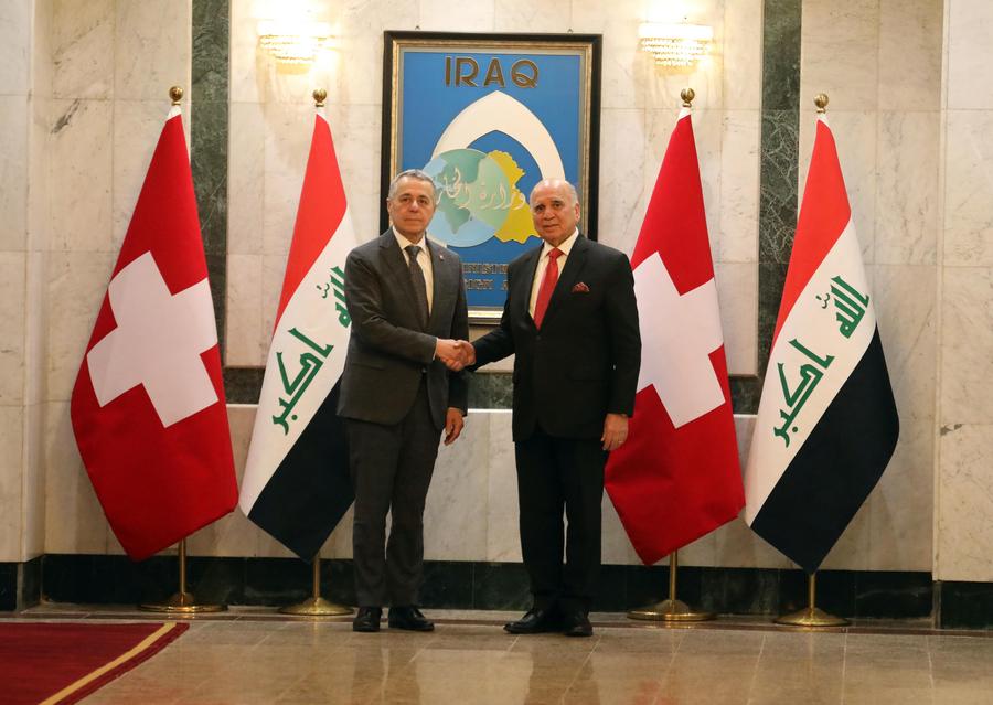 BAGDAD, 23 octobre (Xinhua) -- Le ministre irakien des Affaires étrangères Fuad Hussein (à droite) et son homologue suisse Ignazio Cassis serrent la main lors d'une conférence de presse conjointe à Bagdad, en Irak, le 23 octobre 2025. Jeudi, une délégation suisse de haut niveau est venue à Bagdad pour discuter du renforcement de la coopération bilatérale et des investissements suisses dans des projets de développement majeurs irakiens. (Xinhua/Khalil Dawood)Le ministre irakien des Affaires étrangères Fouad Hussein (à droite) et son homologue suisse Ignazio Cassis participent à une conférence de presse conjointe à Bagdad, en Irak, le 23 octobre 2025. (Xinhua/Khalil Dawood)Le ministre irakien des Affaires étrangères Fuad Hussein (à droite) et son homologue suisse Ignazio Cassis serrent la main lors d'une conférence de presse conjointe à Bagdad, en Irak, le 23 octobre 2025. (Xinhua/Khalil Dawood)■