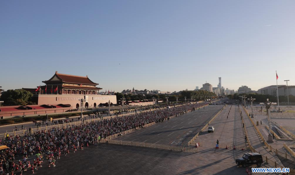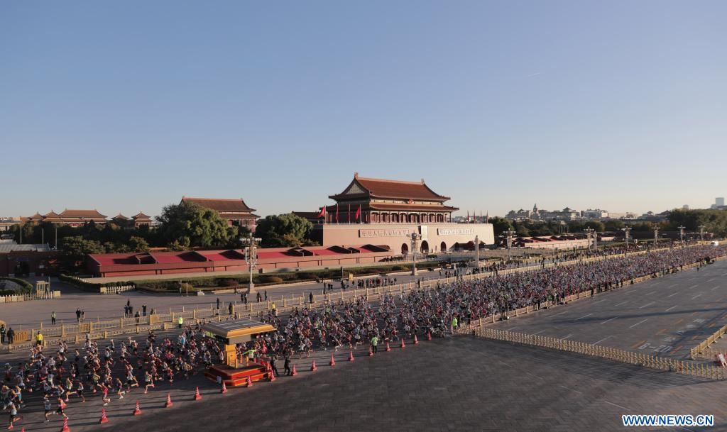 BEIJING, 2 novembre (Xinhua) -- Des participants courent devant la place Tian'anmen lors du marathon de Beijing 2025, à Beijing, capitale chinoise, le 2 novembre 2025. (Photo : Guo Yu)