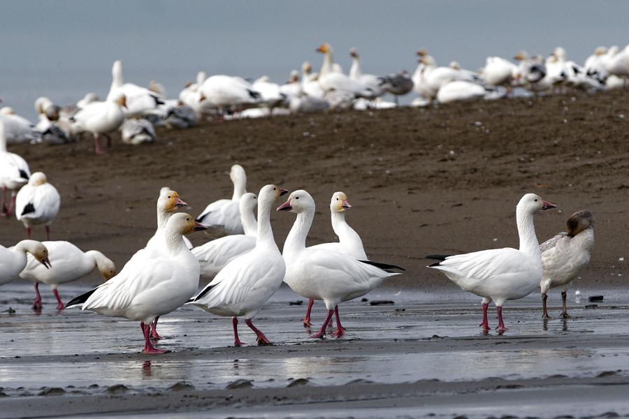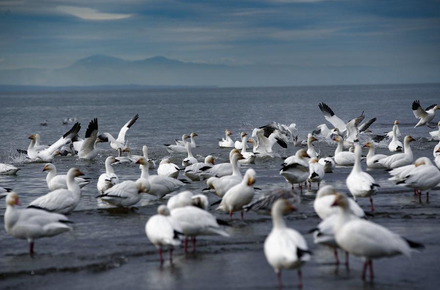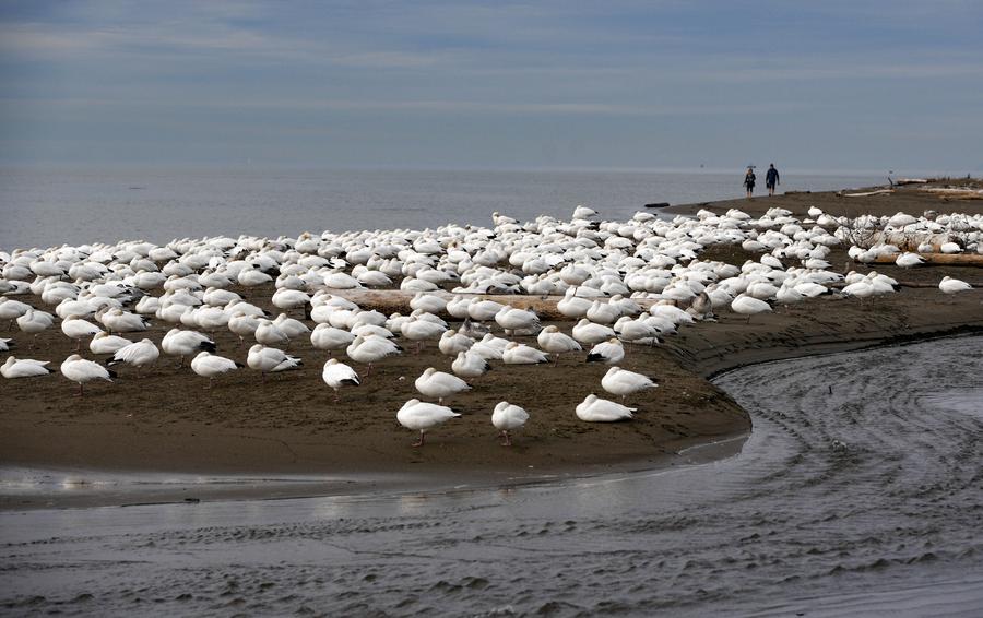 RICHMOND, 9 novembre (Xinhua) -- Des oies des neiges se reposent le long du littoral à Iona Beach, à Richmond, en Colombie-Britannique, au Canada, le 8 novembre 2025. Chaque année, des dizaines de milliers d'oies des neiges migrent de la Sibérie russe vers le sud de la Colombie-Britannique au Canada et l'Etat américain de Washington pour se nourrir et se reposer avant de s'envoler vers le sud, en Californie, pour hiverner. (Xinhua/Liang Sen)Des oies des neiges se reposent le long du littoral à Iona Beach, à Richmond, en Colombie-Britannique, au Canada, le 8 novembre 2025.Des oies des neiges se reposent le long du littoral à Iona Beach, à Richmond, en Colombie-Britannique, au Canada, le 8 novembre 2025.