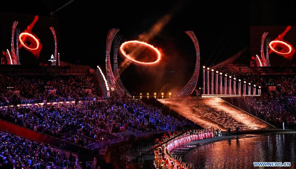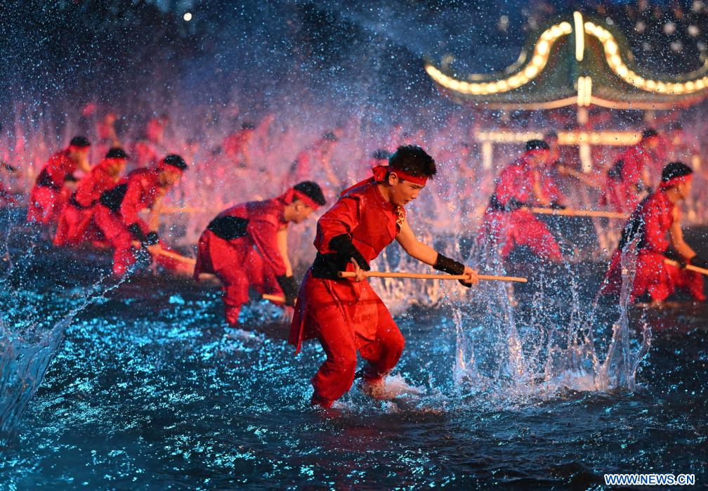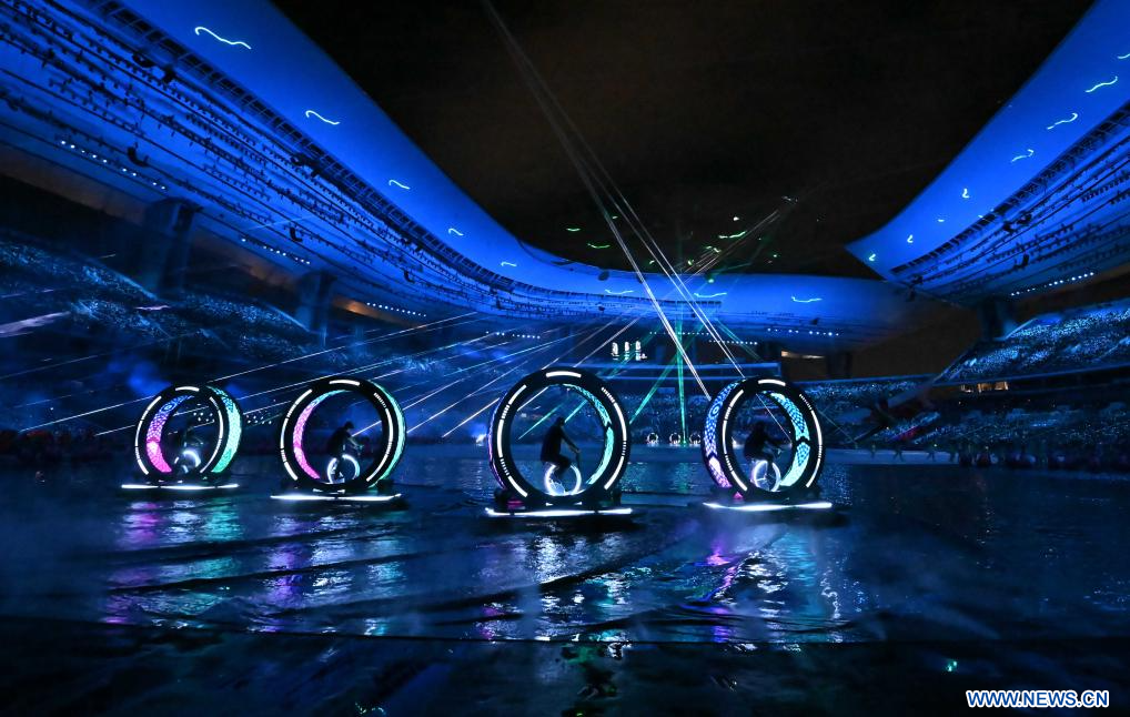 GUANGZHOU, 10 novembre (Xinhua) -- Des artistes participent à la cérémonie d'ouverture des 15es Jeux nationaux chinois, à Guangzhou, dans la province chinoise du Guangdong (sud), le 9 novembre 2025. (Photo : Xiao Yijiu)