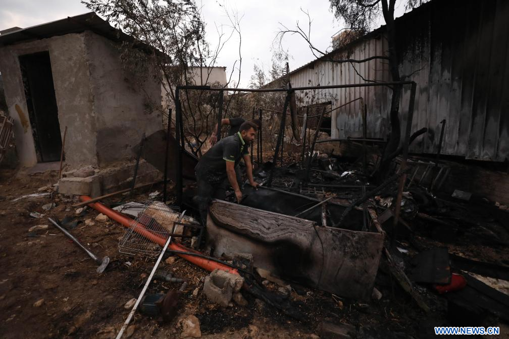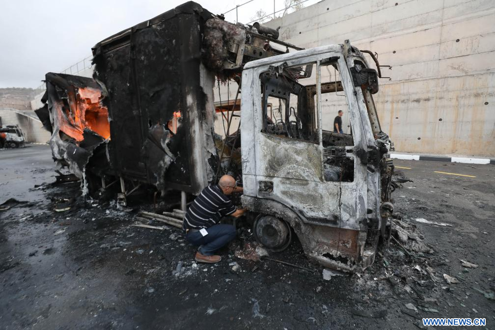 TOULKAREM, 12 novembre (Xinhua) -- Un Palestinien inspecte les dégâts causés par un incendie déclenché par des colons juifs près de la ville de Beit Lid, à l'est de Toulkarem, dans le nord de la Cisjordanie, le 11 novembre 2025. Selon l'agence de presse officielle palestinienne WAFA, des colons juifs ont attaqué mardi des installations industrielles et agricoles près de la ville de Beit Lid, provoquant d'importants incendies et blessant plusieurs Palestiniens. (Xinhua/Nidal Eshtayeh)