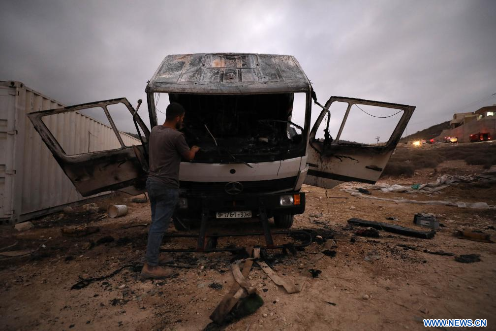 TOULKAREM, 12 novembre (Xinhua) -- Un Palestinien inspecte un véhicule incendié par des colons juifs près de la ville de Beit Lid, à l'est de Toulkarem, dans le nord de la Cisjordanie, le 11 novembre 2025. Selon l'agence de presse officielle palestinienne WAFA, des colons juifs ont attaqué mardi des sites industriels et agricoles près de Beit Lid, provoquant d'importants incendies et blessant plusieurs Palestiniens. (Xinhua/Nidal Eshtayeh)
