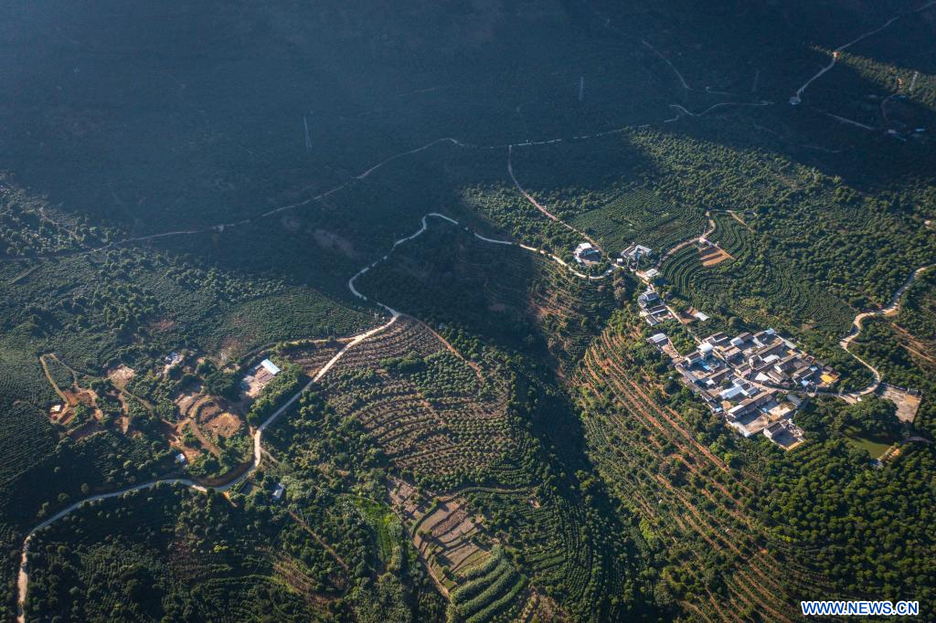 BAOSHAN, 18 novembre (Xinhua) -- Photo aérienne d'une plantation de café située dans le village de Xinzhai, à Baoshan, dans la province chinoise du Yunnan (sud-ouest), le 16 novembre 2025. Les caféiers qui y sont cultivés sont récemment entrés dans la saison de récolte. (Photo : Wang Guansen)