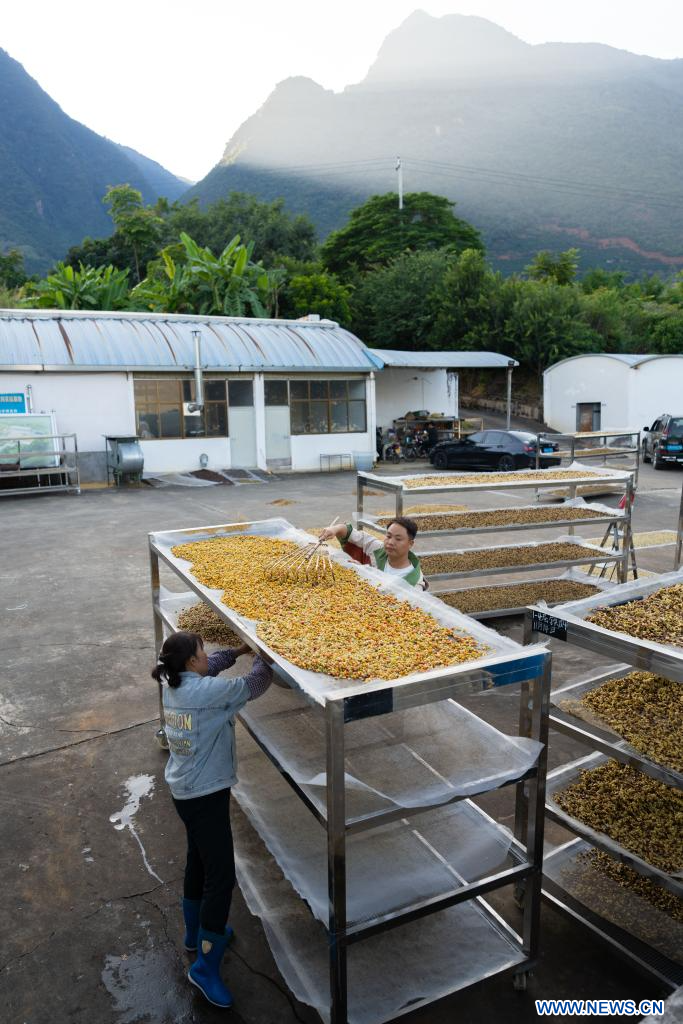 BAOSHAN, 18 novembre (Xinhua) -- Des agriculteurs étalent des grains de café frais pour les faire sécher dans le village de Xinzhai, à Baoshan, dans la province chinoise du Yunnan (sud-ouest), le 16 novembre 2025. Les caféiers qui y sont cultivés sont récemment entrés dans la saison de récolte. (Photo : Gao Yongwei)