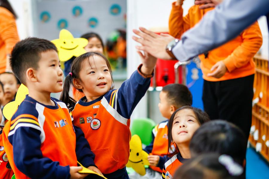 Des bénévoles et des enfants se saluent à la veille de la Journée mondiale du bonjour, célébrée chaque année le 21 novembre, dans une école maternelle de la Nouvelle Zone de Binhai, dans la municipalité de Tianjin (nord), le 20 novembre 2025. (Photo : Du Penghui)