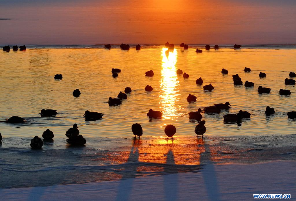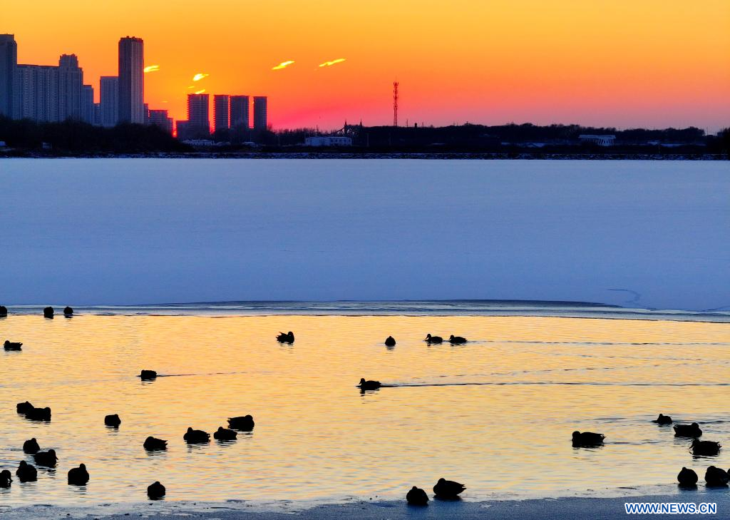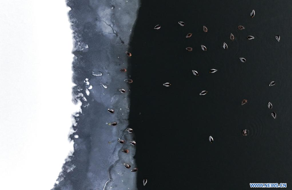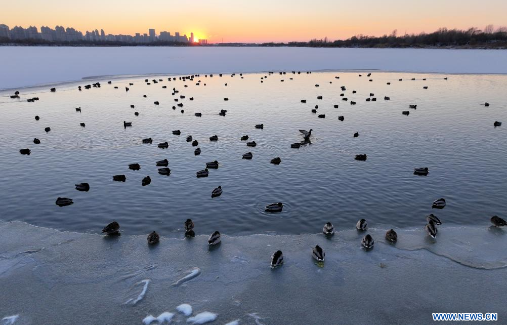 HARBIN, 28 novembre (Xinhua) -- Des colverts se reposant dans la section de Harbin de la rivière Songhua, dans la province chinoise du Heilongjiang (nord-est), le 27 novembre 2025. (Photo : Zhang Shu)