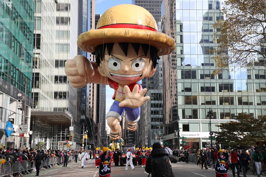NEW YORK, 27 novembre (Xinhua) -- Le ballon de Monkey D. Luffy défile lors de la parade de Thanksgiving 2025 organisée par Macy's à New York, aux Etats-Unis, le 27 novembre 2025. La traditionnelle parade de Thanksgiving de Macy's a communiqué la joie des fêtes à New York jeudi matin, alors que des ballons géants représentant des personnages flottaient au-dessus de Manhattan lors de l'un des événements festifs les plus observés aux Etats-Unis. (Xinhua/Zhang Fengguo)Une fanfare joue lors de la parade de Thanksgiving 2025 organisée par Macy's à New York, aux Etats-Unis, le 27 novembre 2025. La traditionnelle parade de Thanksgiving de Macy's a communiqué la joie des fêtes à New York jeudi matin, alors que des ballons géants représentant des personnages flottaient au-dessus de Manhattan lors de l'un des événements festifs les plus observés aux Etats-Unis. (Xinhua/Zhang Fengguo)Le ballon de Buzz l'Eclair défile lors de la parade de Thanksgiving 2025 organisée par Macy's à New York, aux Etats-Unis, le 27 novembre 2025. La traditionnelle parade de Thanksgiving de Macy's a communiqué la joie des fêtes à New York jeudi matin, alors que des ballons géants représentant des personnages flottaient au-dessus de Manhattan lors de l'un des événements festifs les plus observés aux Etats-Unis. (Xinhua/Zhang Fengguo)