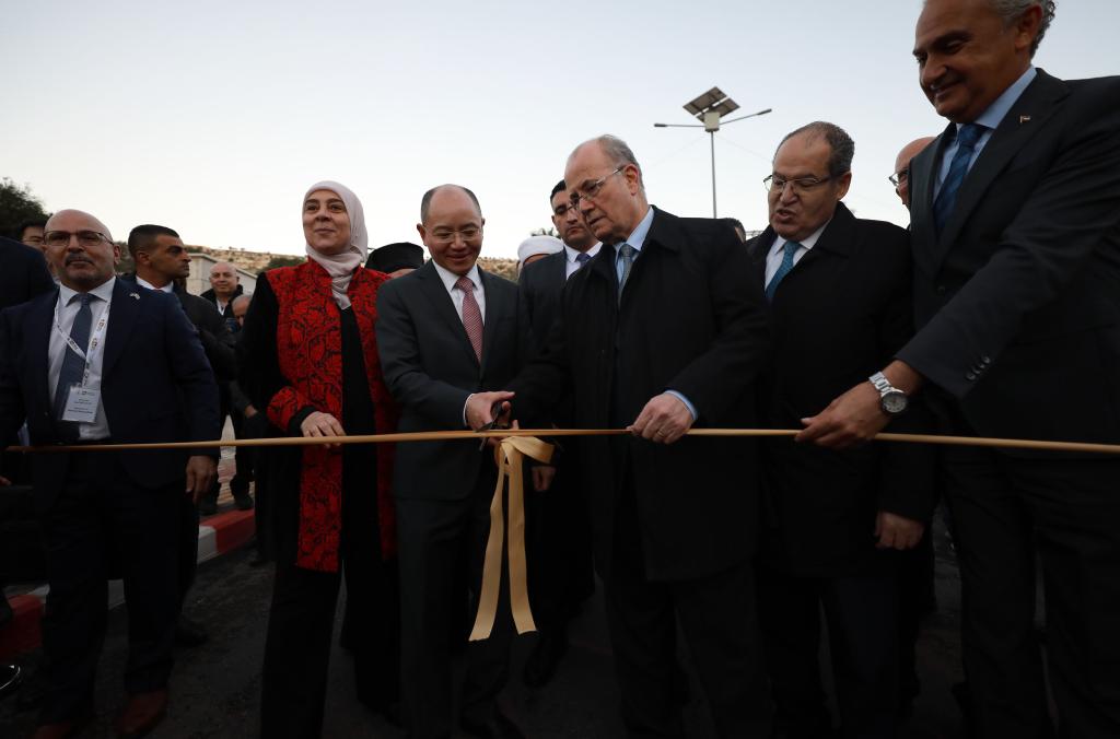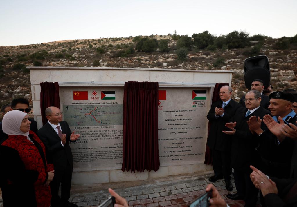RAMALLAH, 28 novembre (Xinhua) -- Des responsables assistent à une cérémonie marquant l'achèvement de deux projets d'infrastructure financés par la Chine, sur la Route de Beijing dans la ville cisjordanienne de Ramallah, le 26 novembre 2025. (Xinhua/Ayman Nobani)