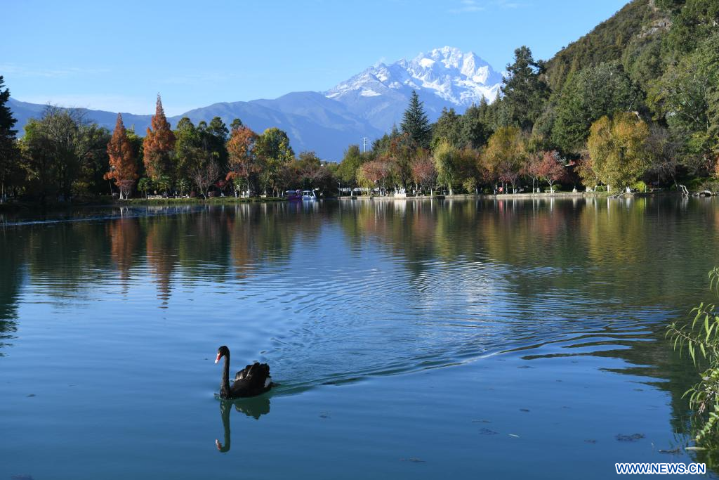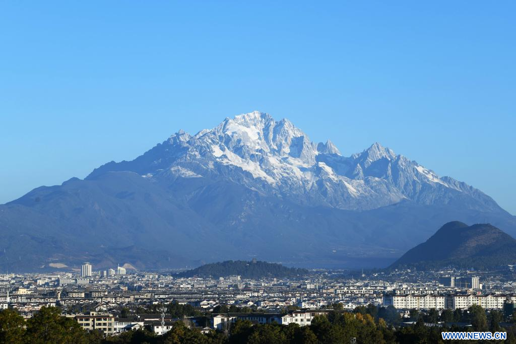 LIJIANG, 30 novembre (Xinhua) -- Photo prise depuis le parc Heilongtan du mont Yulong enneigé à Lijiang, dans la province chinoise du Yunnan (sud-ouest), le 28 novembre 2025. (Photo : Zhao Qingzu)