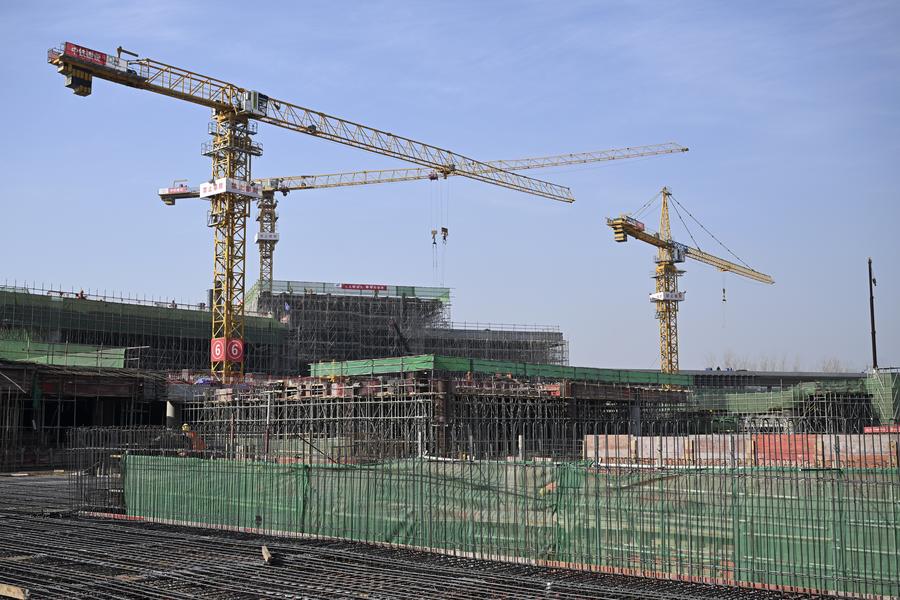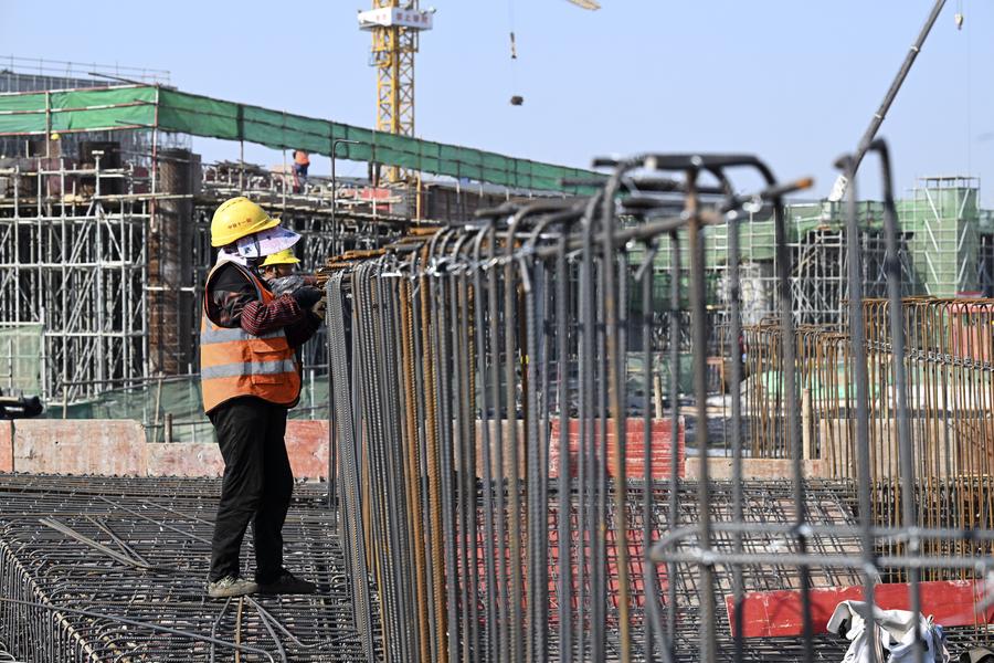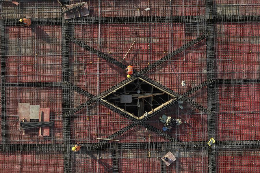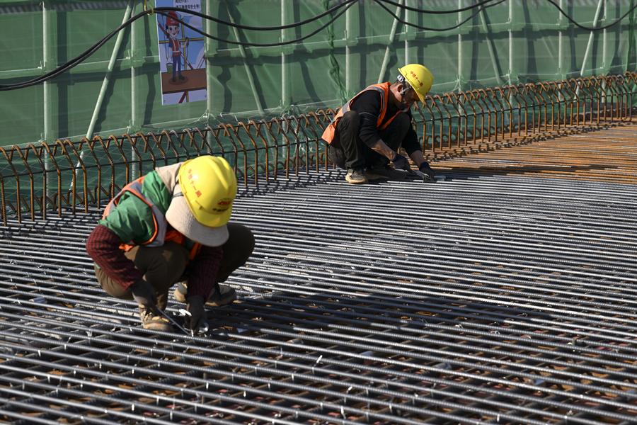 Des ouvriers travaillant sur le chantier de construction d'une place devant la gare de l'Ouest de Huaibei, à Huaibei, dans la province chinoise de l'Anhui (est), le 30 novembre 2025.(Photo : Huang Bohan)