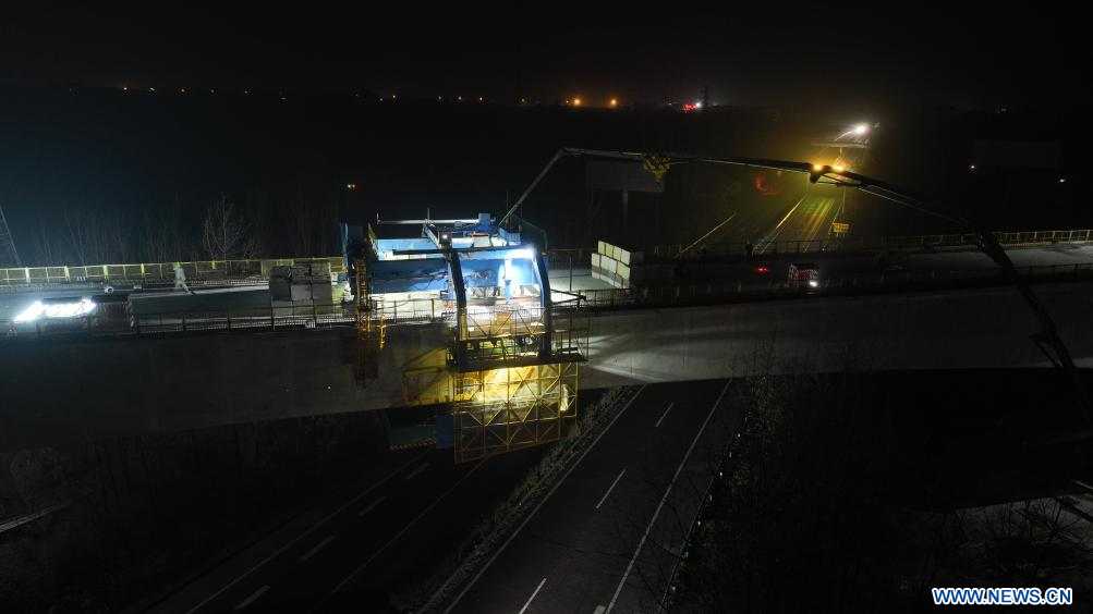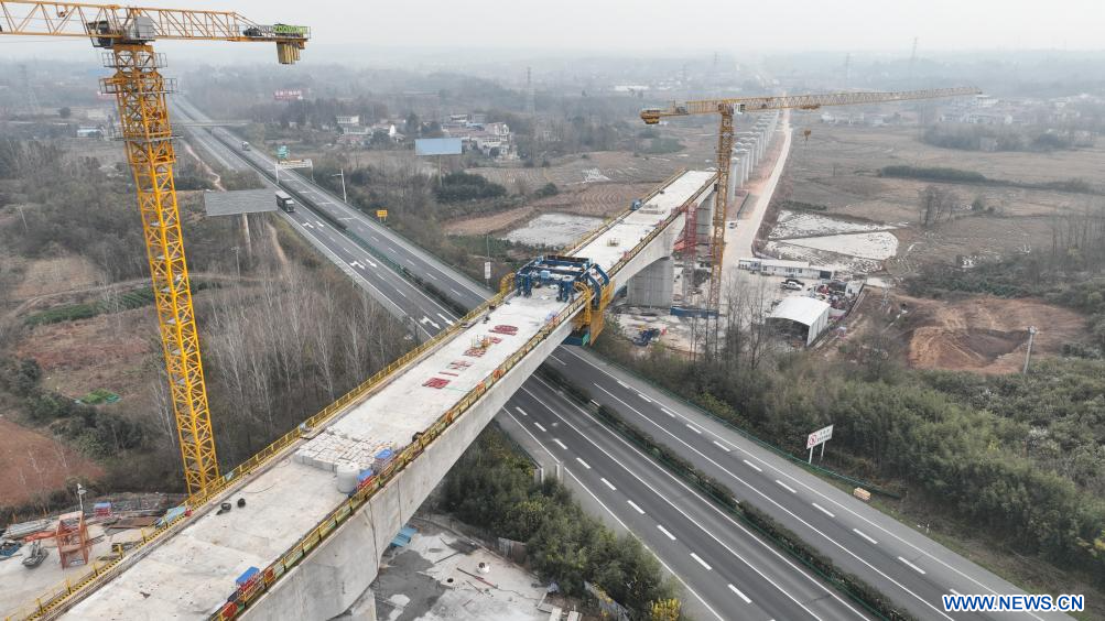 LU'AN, 2 décembre (Xinhua) -- Photo aérienne prise le 2 décembre 2025 montrant le chantier de construction d'un pont de la ligne à grande vitesse Hefei-Wuhan, au-dessus de l'autoroute Shanghai-Chengdu, dans le district de Jinzhai à Lu'an, ville de la province chinoise de l'Anhui (est). D'une longueur de 1.940,57 mètres, ce pont a été achevé mardi.